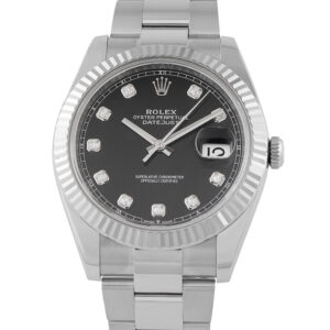 This is a pre-owned Rolex Datejust 41 Black Dial with Diamonds White Rolesor Watch 126334. It comes complete with papers and the manufacturer’s box.