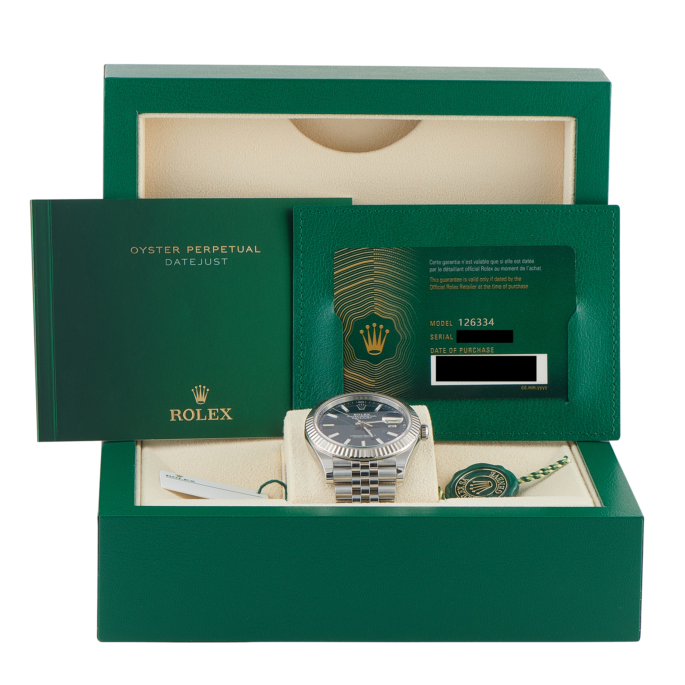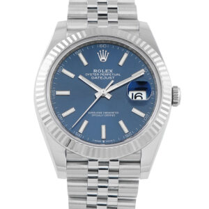 This pre-owned Rolex Datejust 41 Blue Dial Jubilee White Rolesor Watch 126334 is accompanied by papers and the manufacturer’s box.