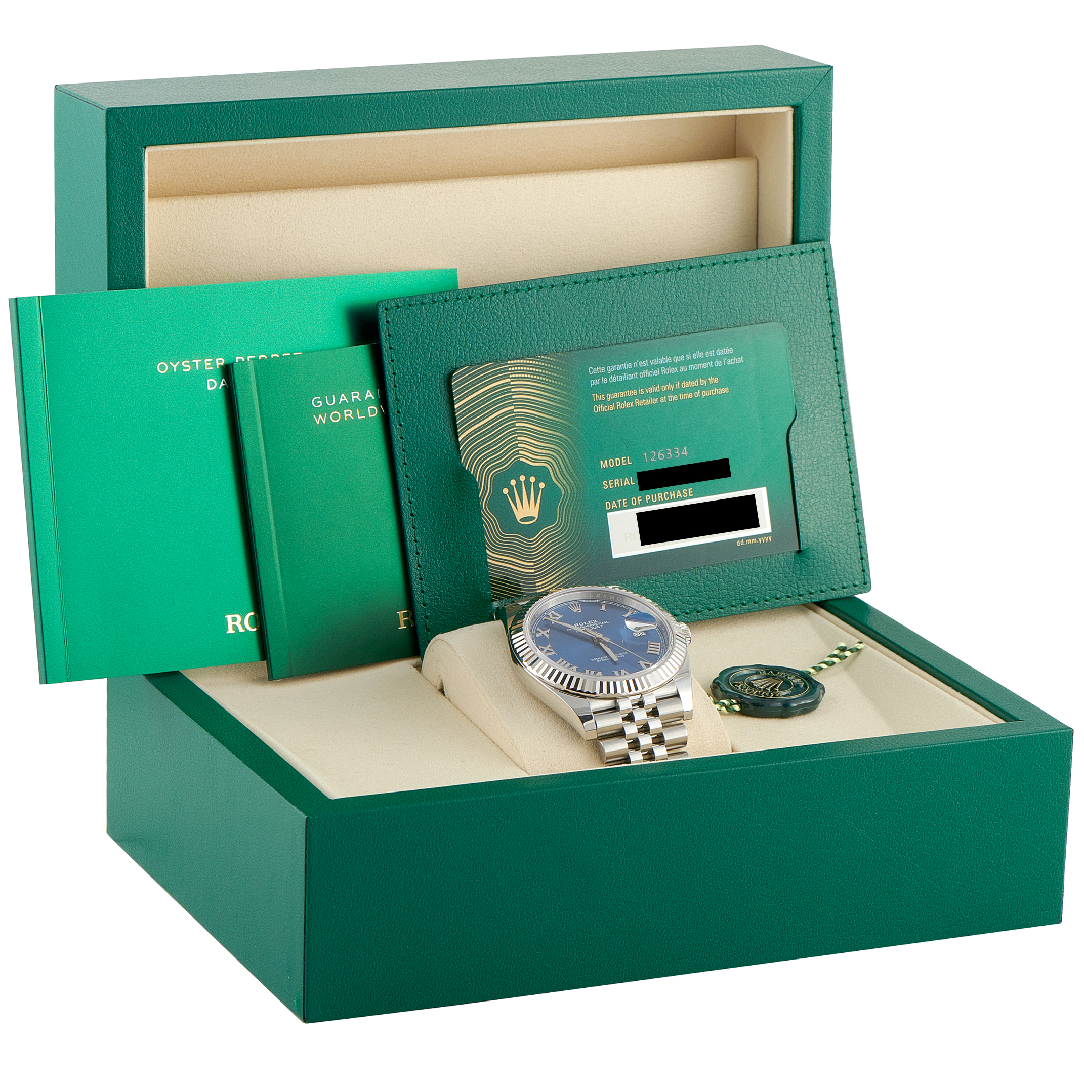 Papers and the manufacturer’s box accompany this unworn Rolex Datejust 41 Blue Roman Dial White Rolesor Jubilee Watch 126334.