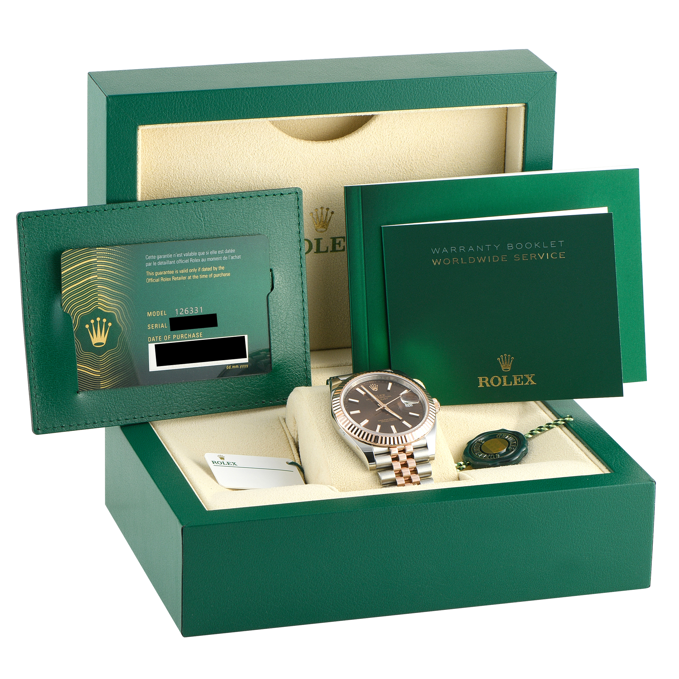 Offered pre-owned, this Rolex Datejust 41 Chocolate Dial Jubilee Everose Rolesor Watch 126331 comes with papers and the manufacturer’s box.