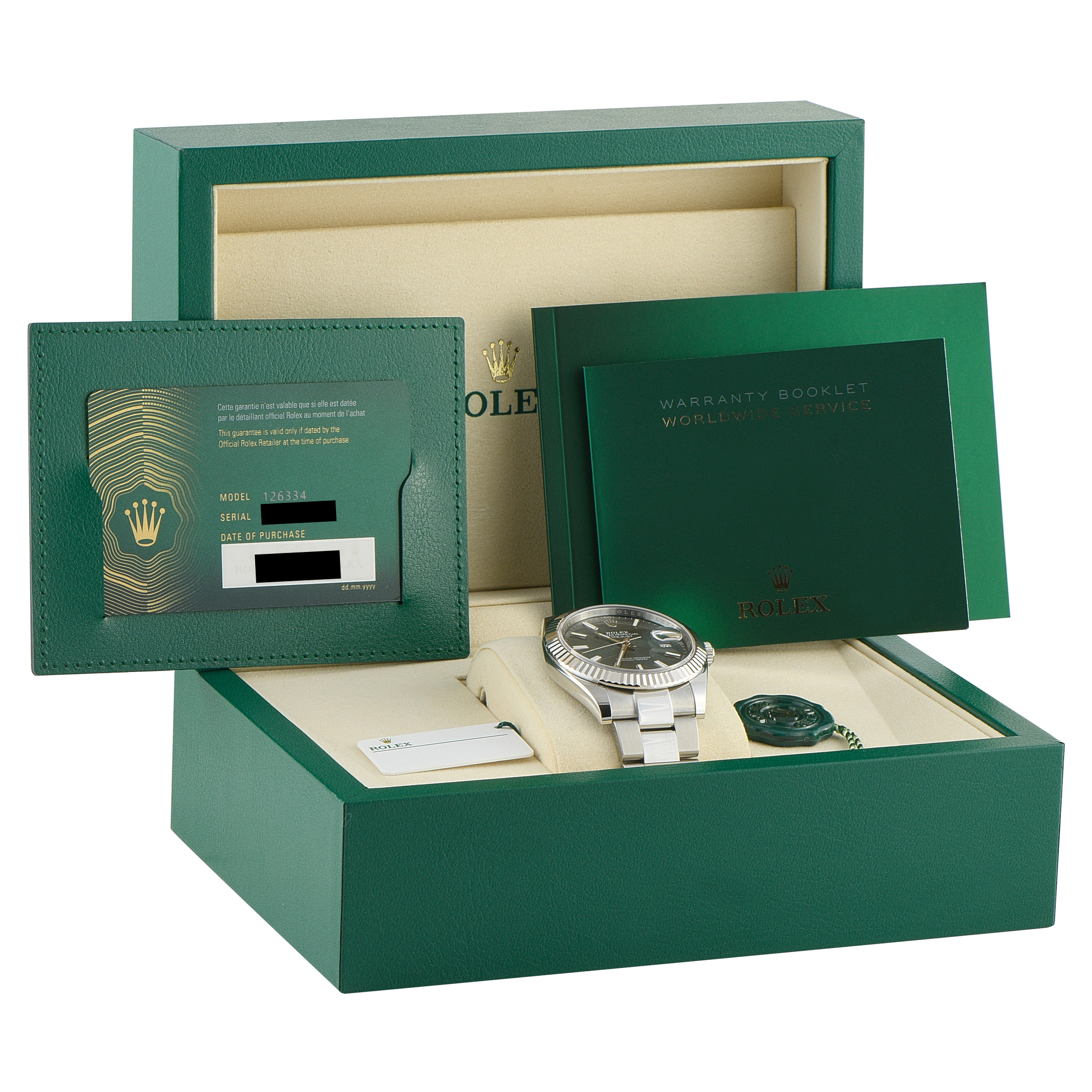 Offered unworn, this Rolex Datejust 41 Green Dial White Rolesor Watch 126334 is accompanied by papers and the manufacturer’s box.