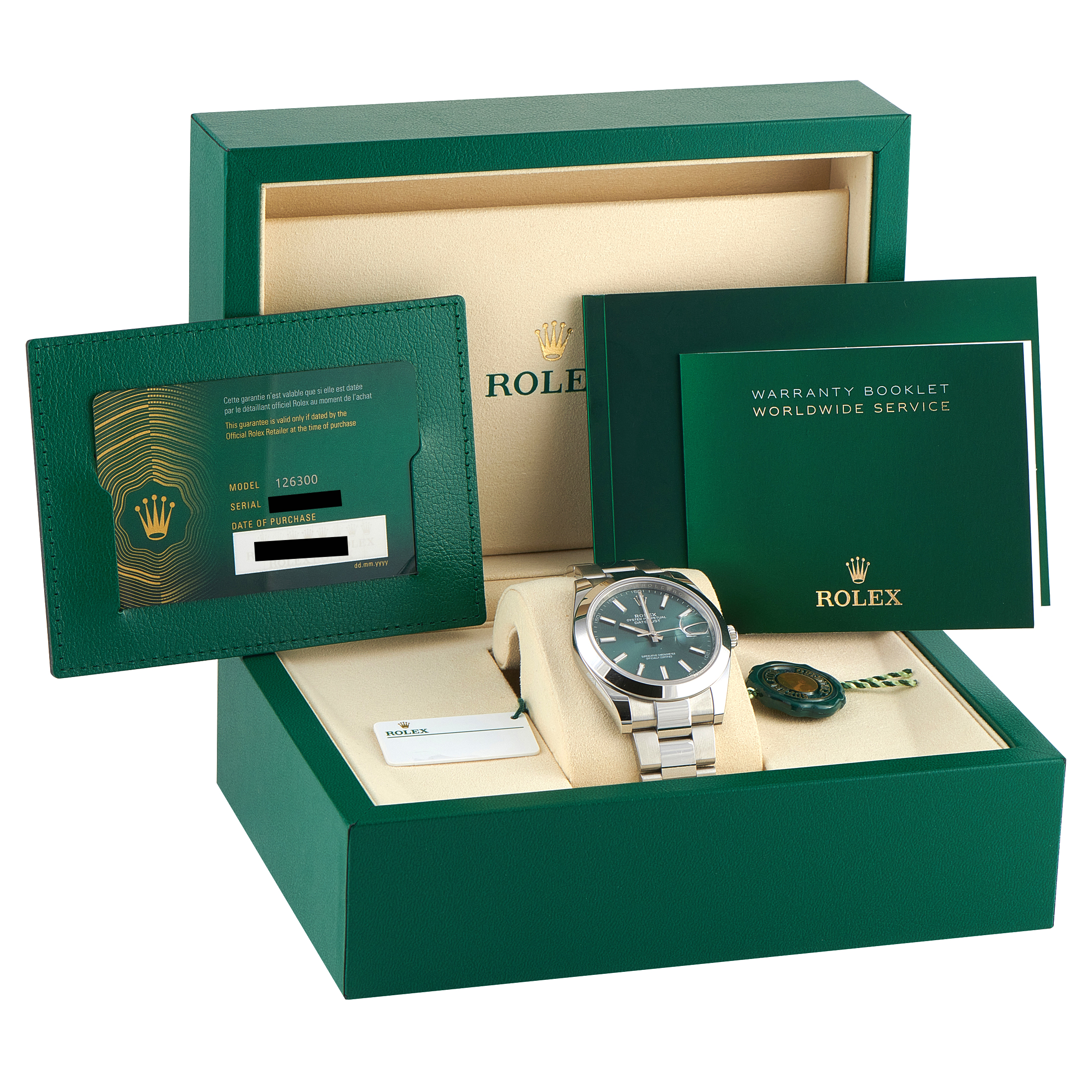This is an unworn Rolex Datejust 41 Green Dial Oystersteel Watch 126300. It is accompanied by papers and the manufacturer’s box.