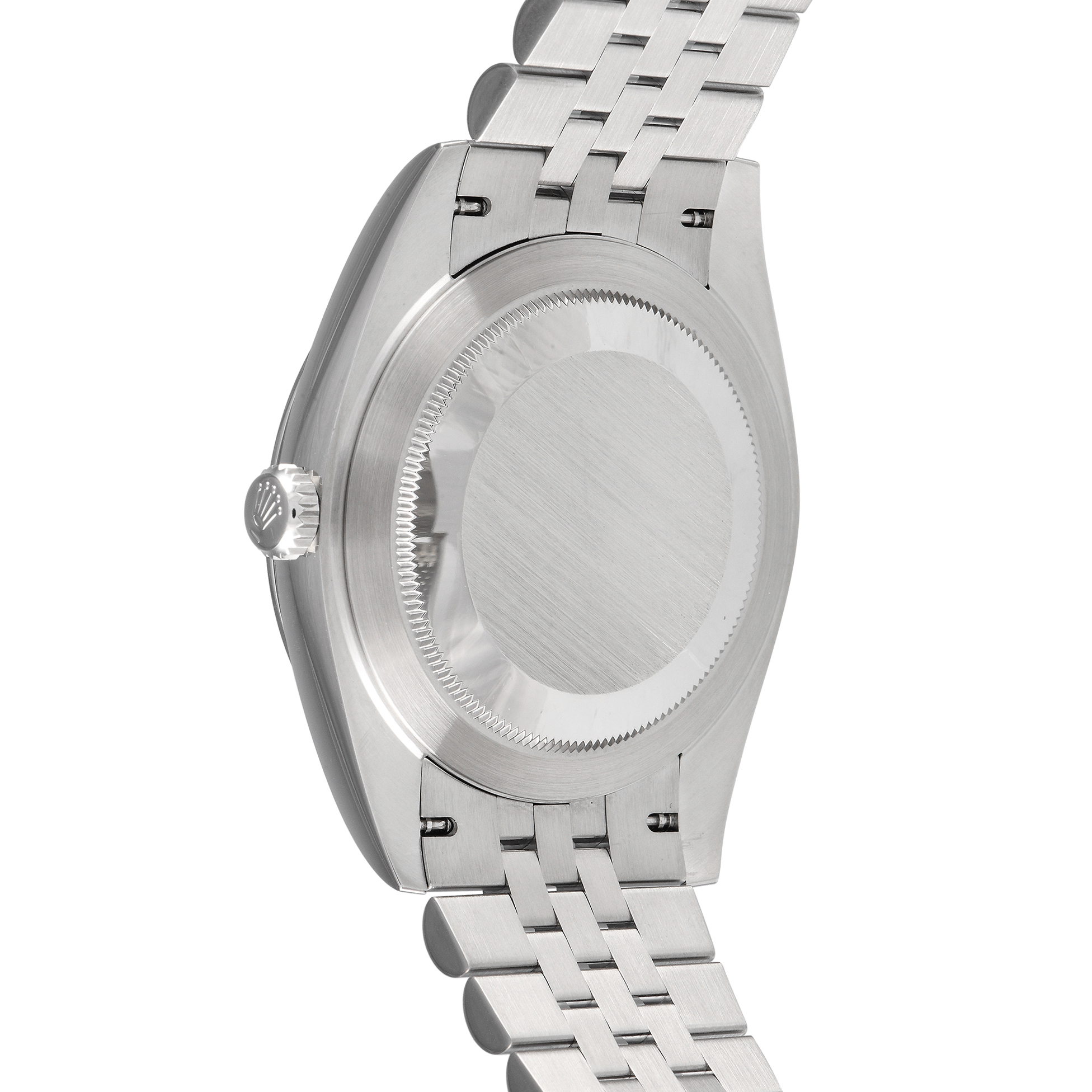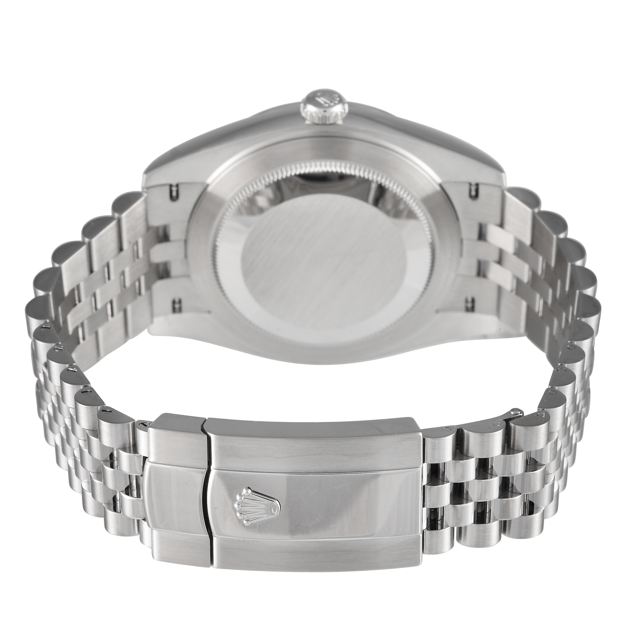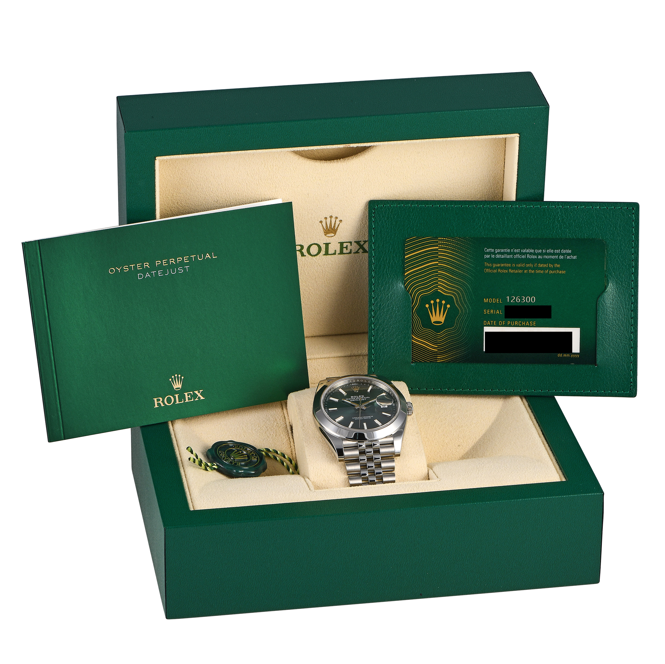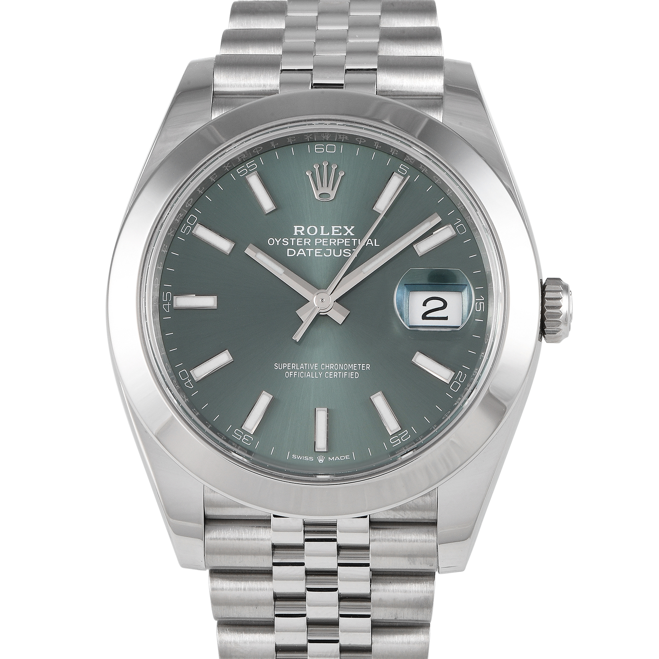 Papers and the manufacturer’s box accompany this pre-owned Rolex Datejust 41 Mint Green Dial Oystersteel Jubilee Watch 126300.