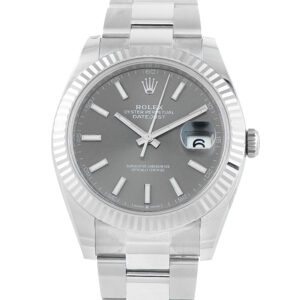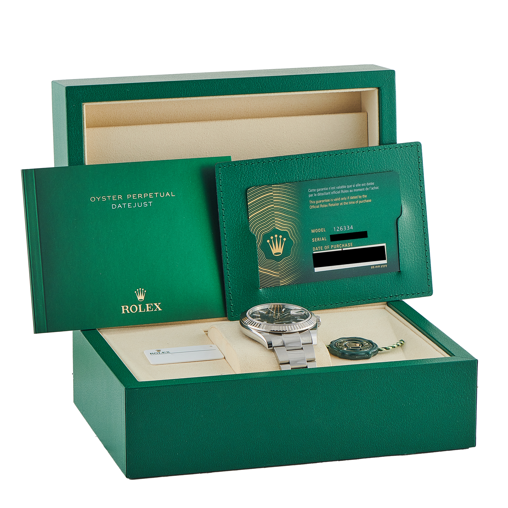 This is a pre-owned Rolex Datejust 41 Slate Dial Oyster Watch 126334. It comes with papers and the manufacturer’s box.