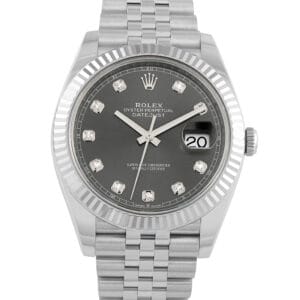 This is a pre-owned Rolex Datejust 41 Slate Dial with Diamonds Jubilee Watch 126334. It comes with papers and the manufacturer’s box.