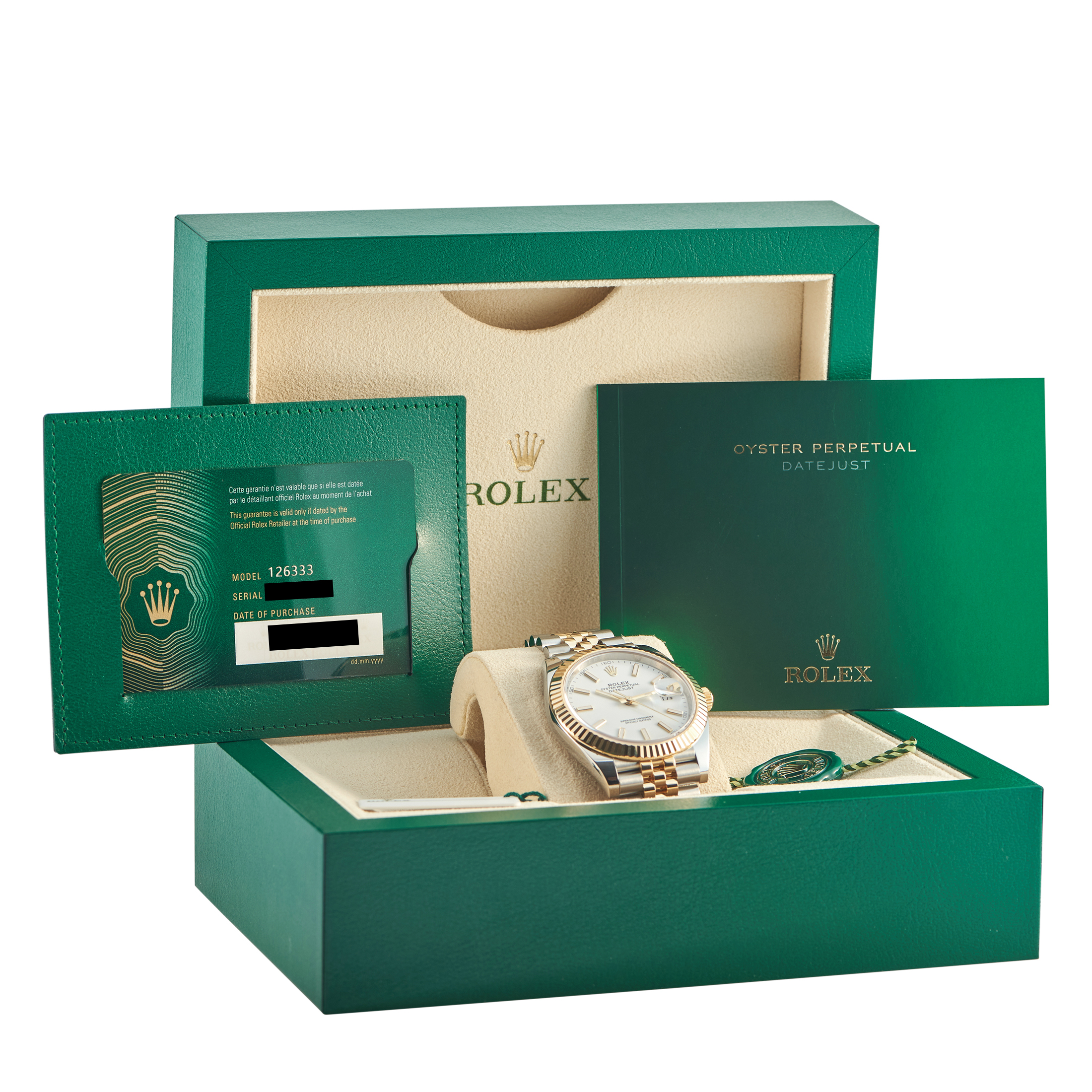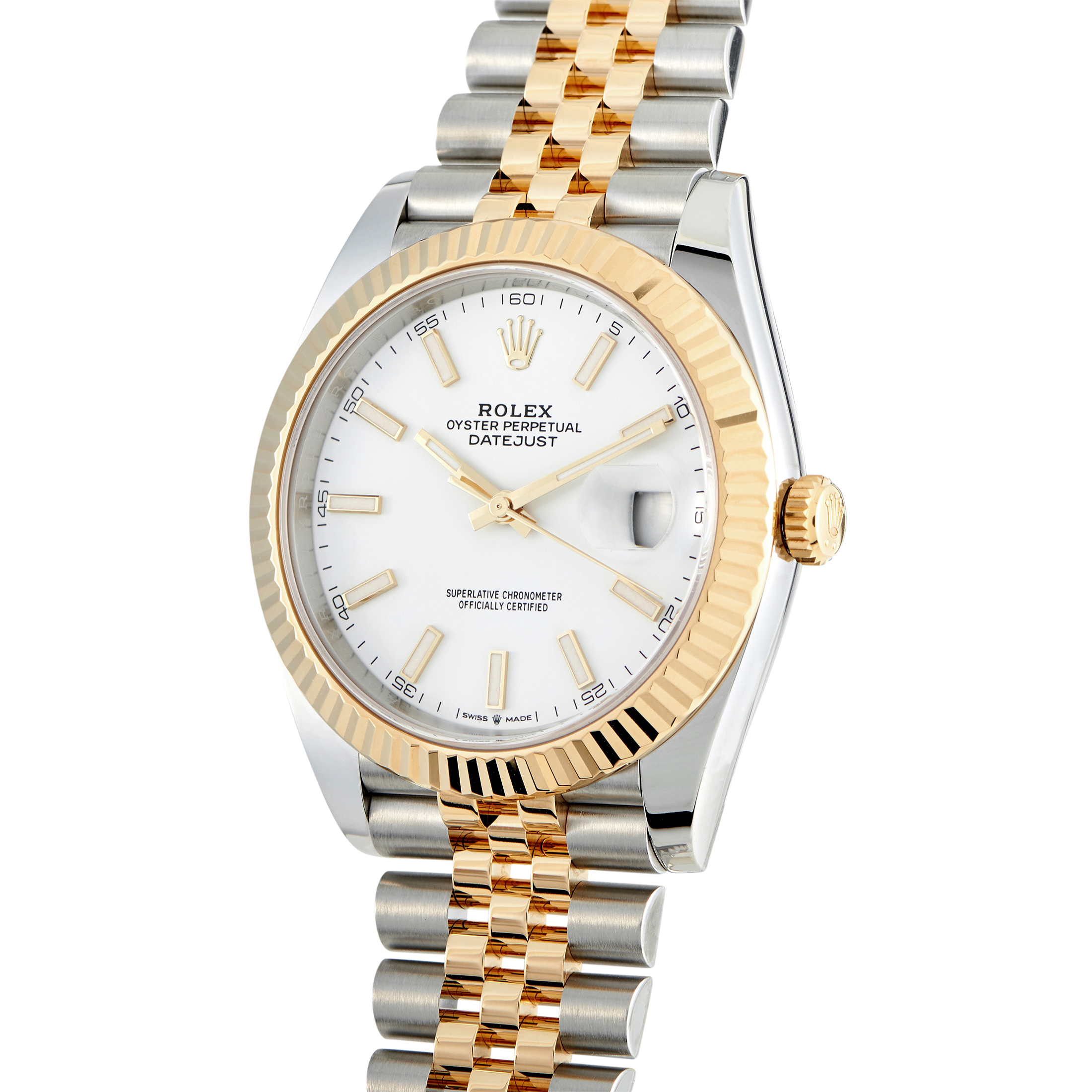 This is a pre-owned Rolex Datejust 41 White Dial Yellow Rolesor Jubilee Watch 126333. It is presented as a complete set, with the manufacturer’s box and papers.