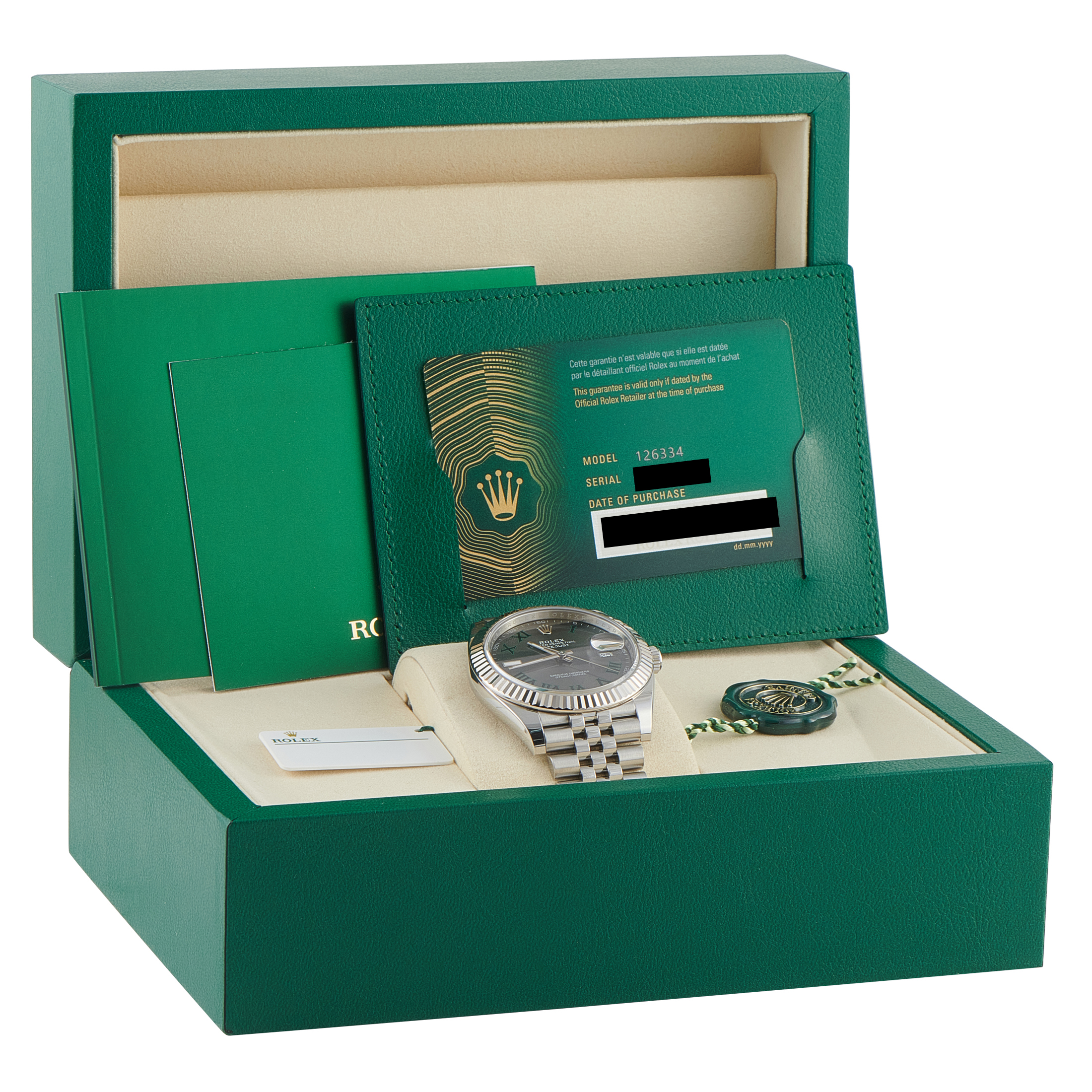 Offered pre-owned, this Rolex Datejust 41 Wimbledon Dial White Rolesor Jubilee Watch 126334 includes the manufacturer’s box and papers.