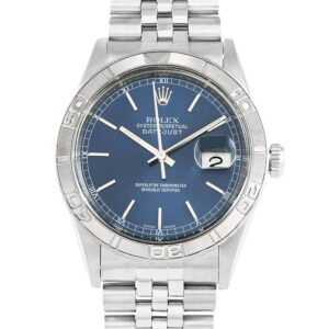 Also known as the Rolex Thunderbird, the Datejust Turn-O-Graph ref.16264 was developed for the U.S. Air Force Thunderbirds aerobatic squadron. This particular variation features a rotating Turn-O-Graph bezel in 18K white gold. Housed on a 36mm steel case is a blue dial with stick hour markers, luminescent hands, and a date window at 3 o’clock. The watch is driven by caliber 3135 automatic movement with 31 jewels and 48 hours of power reserve. The watch is worn on a dressy Jubilee bracelet known for its five-link construction, with polished center links and brushed outer links.