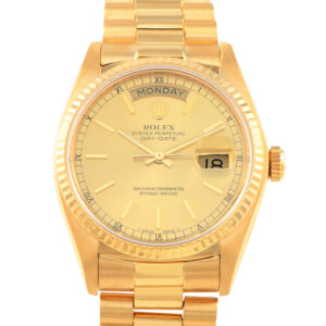 Sought after by collectors, here is an elegant 36mm Day-Date ref.M18038 to add to your collection. This discontinued model is admired for its solid 18K yellow gold construction, President bracelet, and classic champagne dial. It bears Rolex’s signature fluted bezel and is equipped with caliber 3055 with a single quick-set date function. The dial with baton hour markers and hands, and apertures for the date and day of the week, is protected by a sapphire crystal.