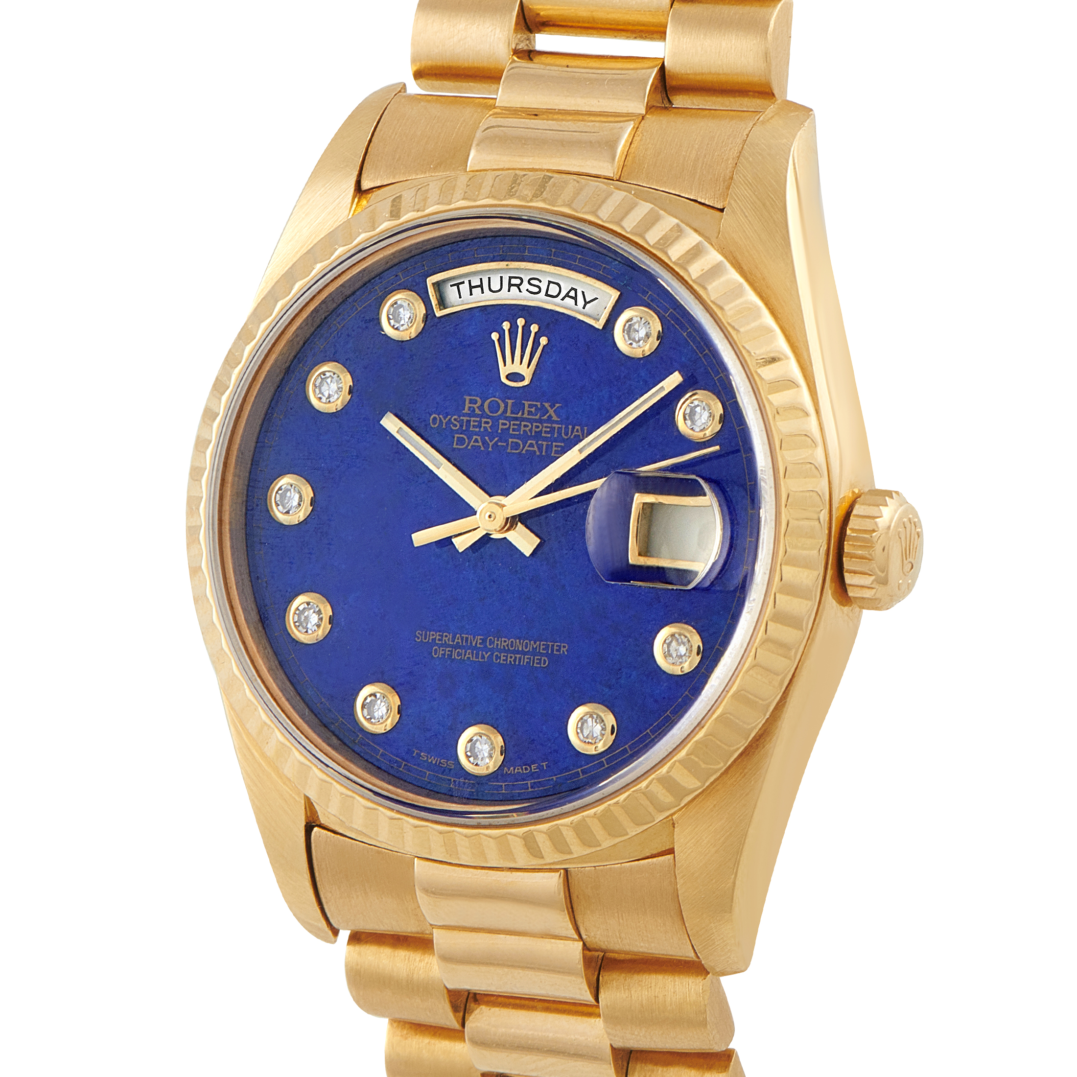 This is a masterpiece featuring a vivid lapis blue dial perfectly framed by the warmth of 18K yellow gold. A celebrated model within the prestigious Day-Date collection, this 36mm full yellow gold timepiece is worn on a President bracelet and has bezel-set round diamonds for its hour markers. The watch is powered by the Rolex automatic caliber 3155 with a convenient double quickset function for independent adjustment of the day and date displays.