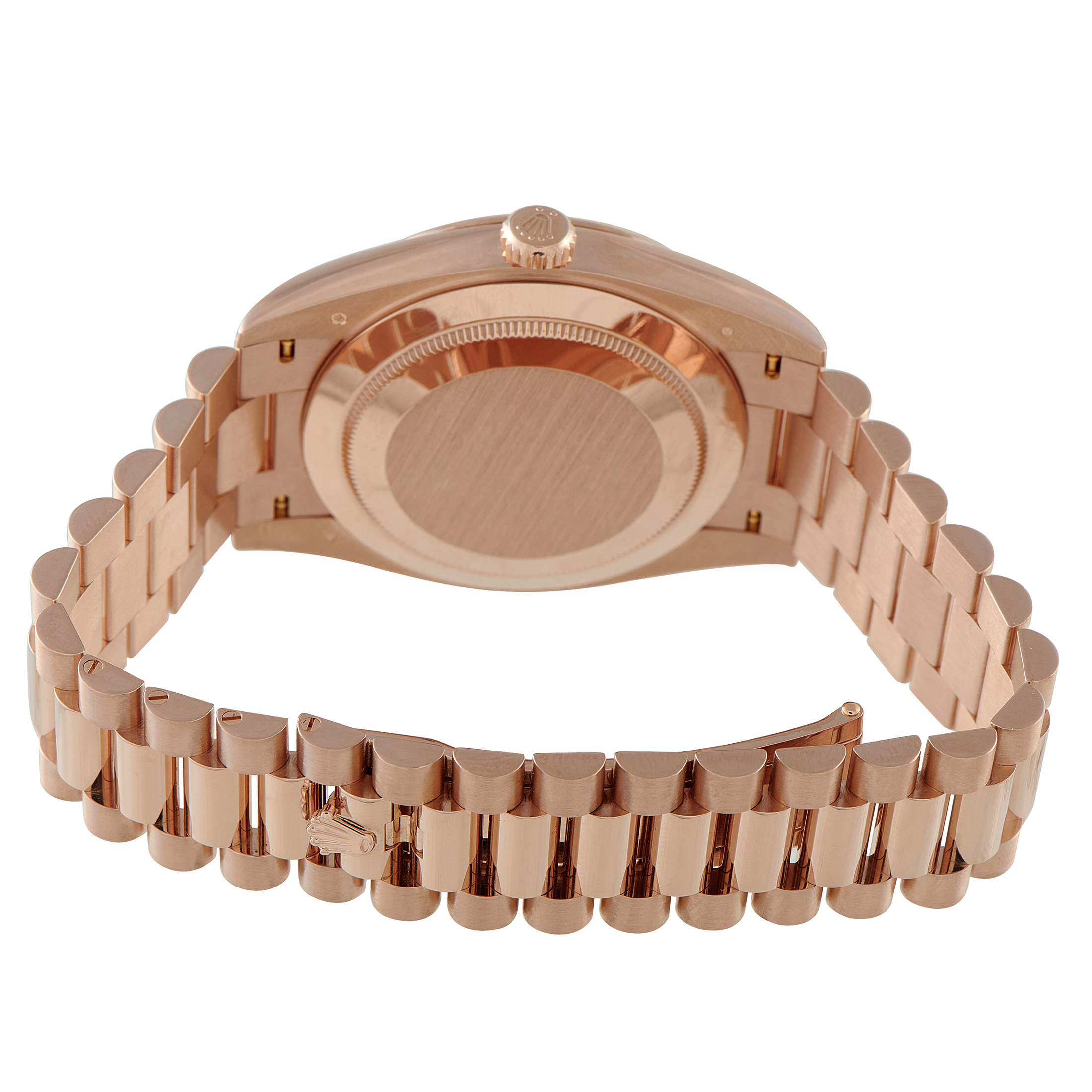 This watch is rendered in full 18k Everose gold, from the 40mm case and fluted bezel to the crown, lugs, caseback, and iconic President bracelet. The in-house caliber 3255 self-winding movement provides a 3-day power reserve and accuracy within 2 seconds per day.