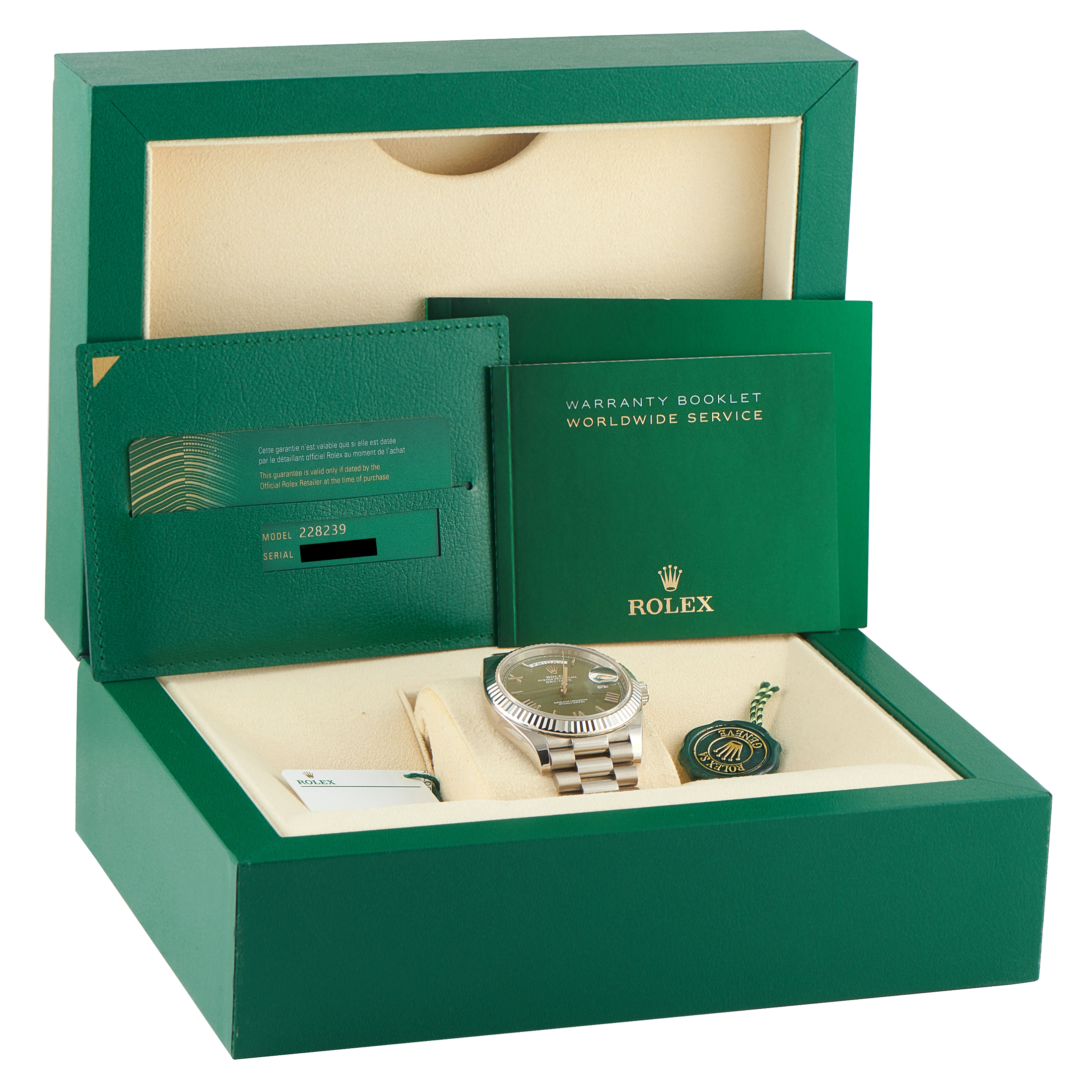 Papers and the manufacturer’s box accompany this pre-owned Rolex Day-Date 40 Green Dial White Gold Watch 228239.