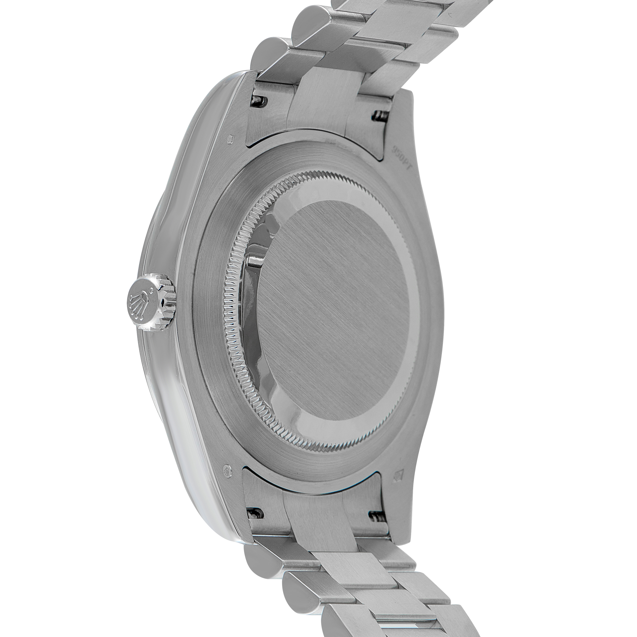 A monochromatic phantom. This Day-Date ref. 218206 features an ebony dial and matching black numerals for low-profile visibility. The 41mm case bears a smooth platinum bezel that creates the matte-on-gloss contrast with the dial. Inside runs caliber 3156, an automatic movement that utilizes Paraflex shock absorbers to maintain steady operation through daily movement. This reference exists as a scarce outlier, offering strong value while remaining discreet as it blends into the shadows.