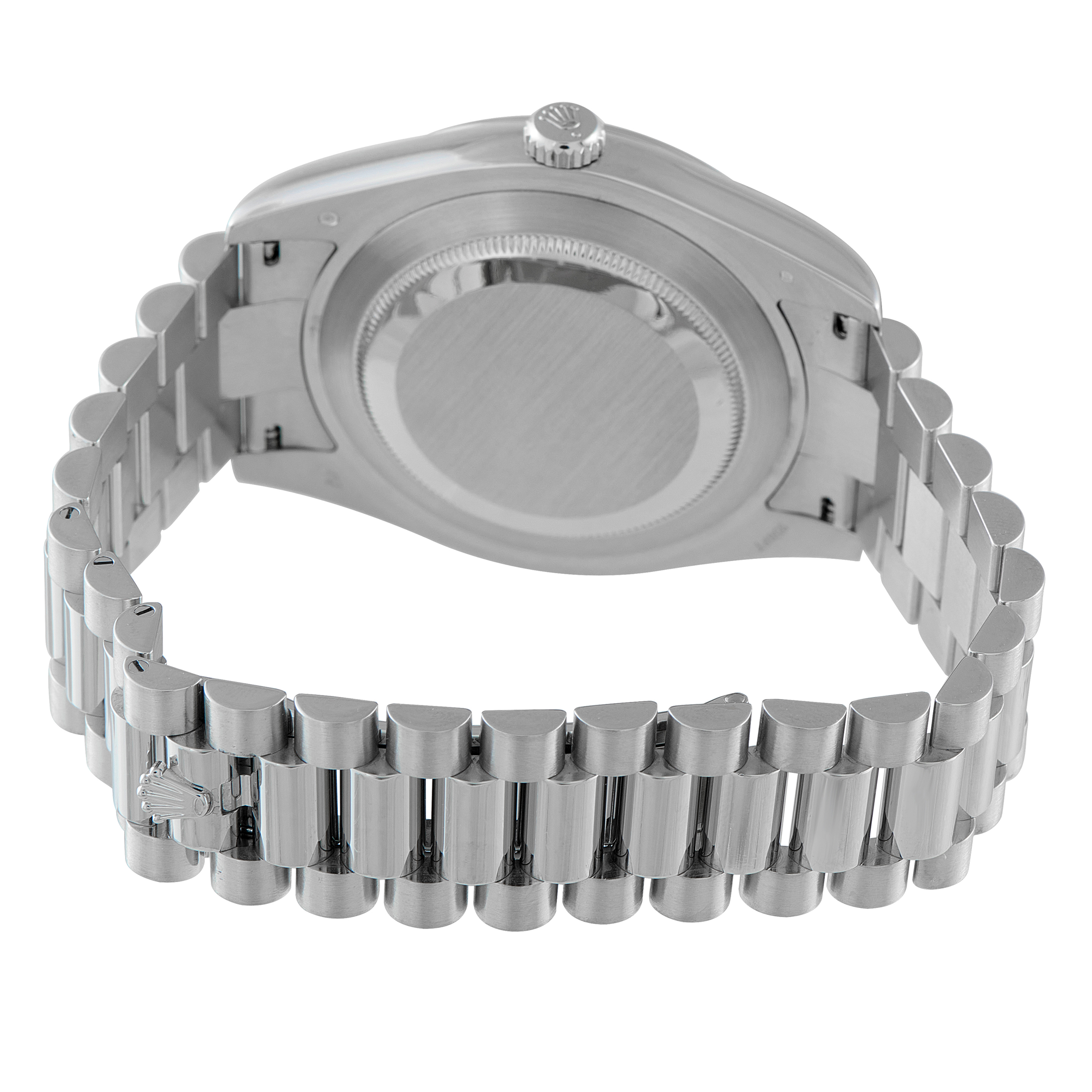 This pre-owned Rolex Day-Date Black on Black Platinum President Watch 218206 is accompanied by a gift box.