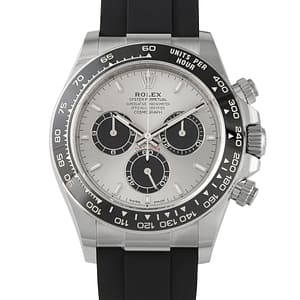 A much-coveted Rolex model, the black-dialed Cosmograph Daytona ref.126519LN captivates attention with its seamless fusion of luxury and practicality. Its 40mm case is crafted in 18K white gold and paired with a black ceramic bezel. The watch is worn on a black Oysterflex strap featuring a unique cushioning system that provides a snug yet comfortable fit. A bright black dial with silver-colored sub-dials ensures versatility and readability. Featured in the white gold Rolex Daytona ref. 126519LN is the in-house caliber 4131 beating at 4Hz frequency, offering a power reserve of approximately 72 hours.