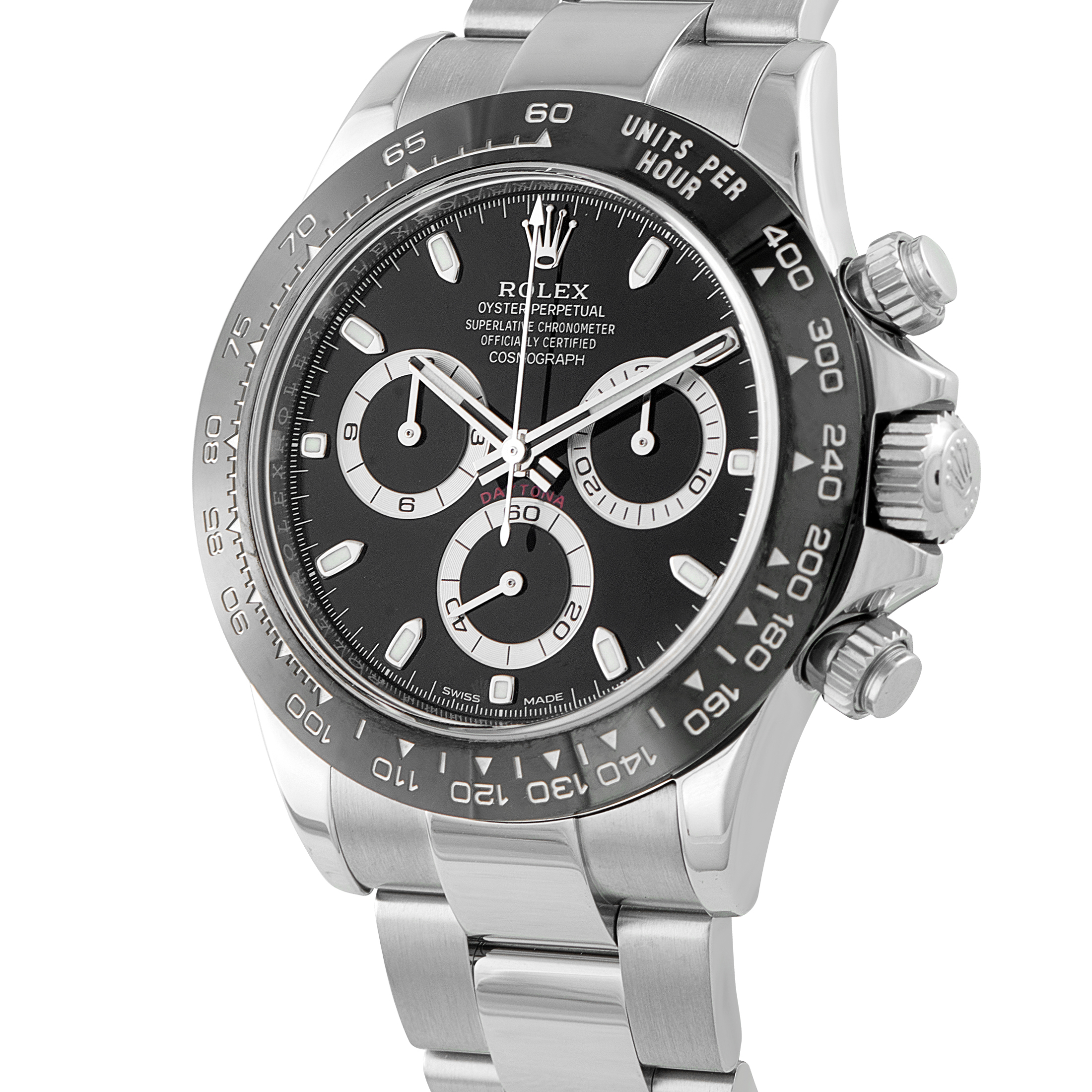 Offered pre-owned, this Rolex Cosmograph Daytona Black Dial Steel Watch 116500LN comes with papers and the manufacturer’s box.