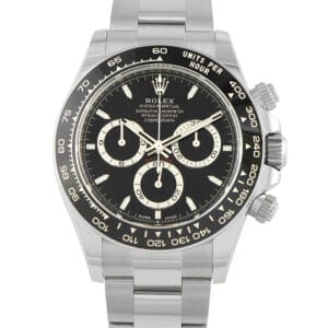 The Rolex Cosmograph Daytona ref. 126500LN with a black dial presents itself as a sleek, technical, and unmistakably modern timepiece. It has a 40mm Oystersteel case, framed by a black Cerachrom bezel engraved with a high-contrast tachymetric scale. Its black lacquer dial sets a commanding tone, with silver-ringed chronograph counters, luminous hands, and luminous hour markers. Beneath the surface lies the Caliber 4131, an automatic movement delivering approximately 72 hours of power reserve.