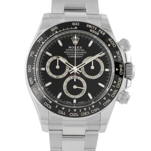 The Rolex Cosmograph Daytona ref. 126500LN with a black dial presents itself as a sleek, technical, and unmistakably modern timepiece. It has a 40mm Oystersteel case, framed by a black Cerachrom bezel engraved with a high-contrast tachymetric scale. Its black lacquer dial sets a commanding tone, with silver-ringed chronograph counters, luminous hands, and luminous hour markers. Beneath the surface lies the Caliber 4131, an automatic movement delivering approximately 72 hours of power reserve.