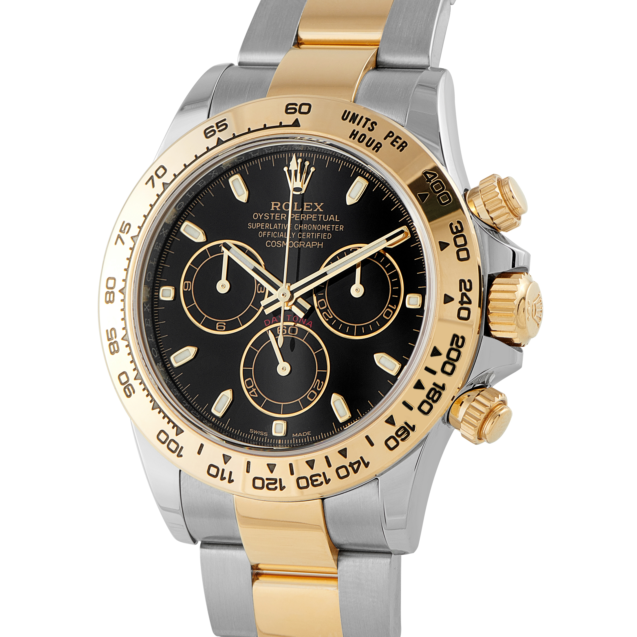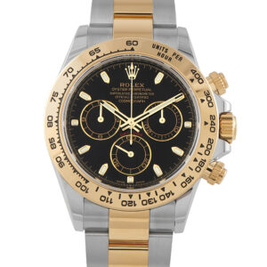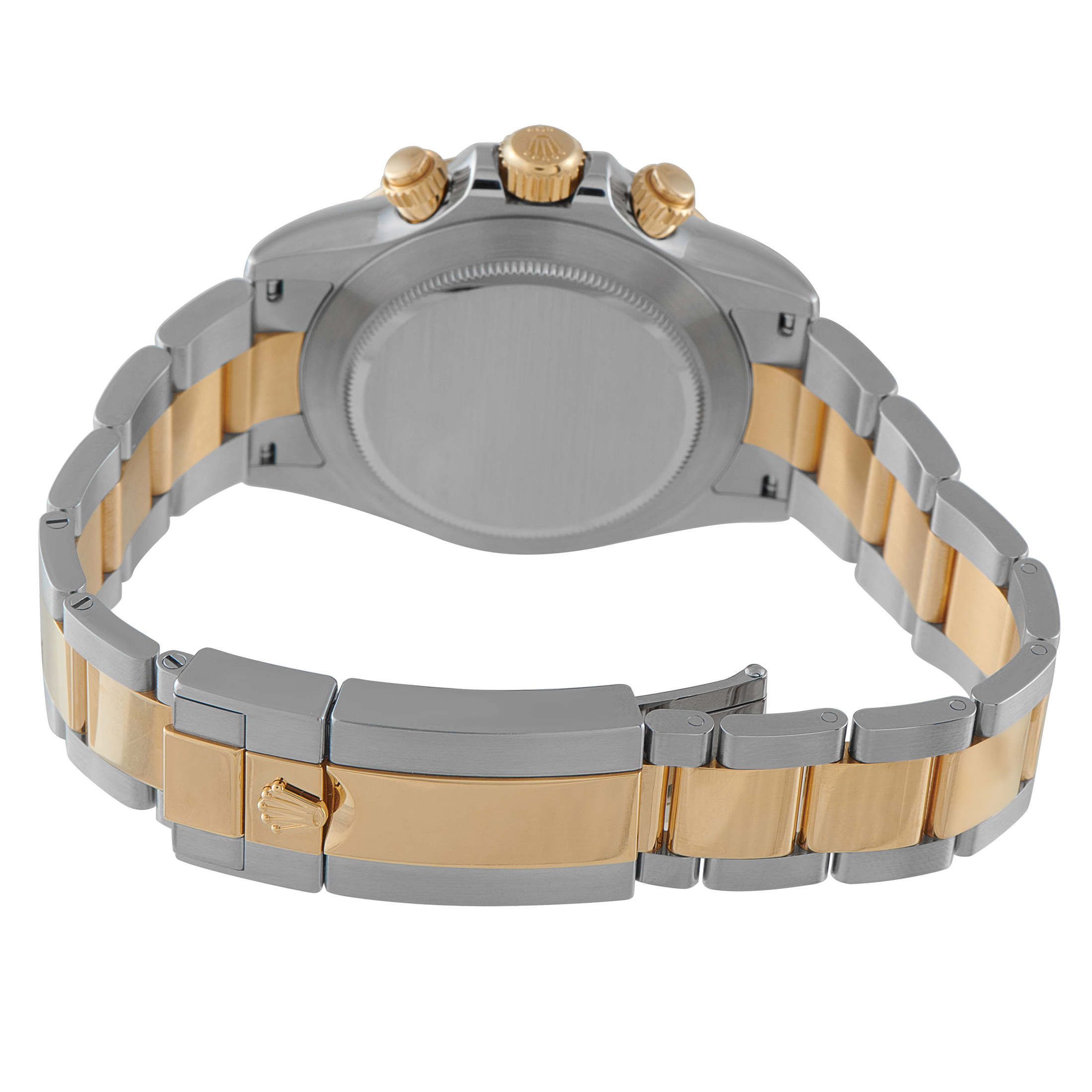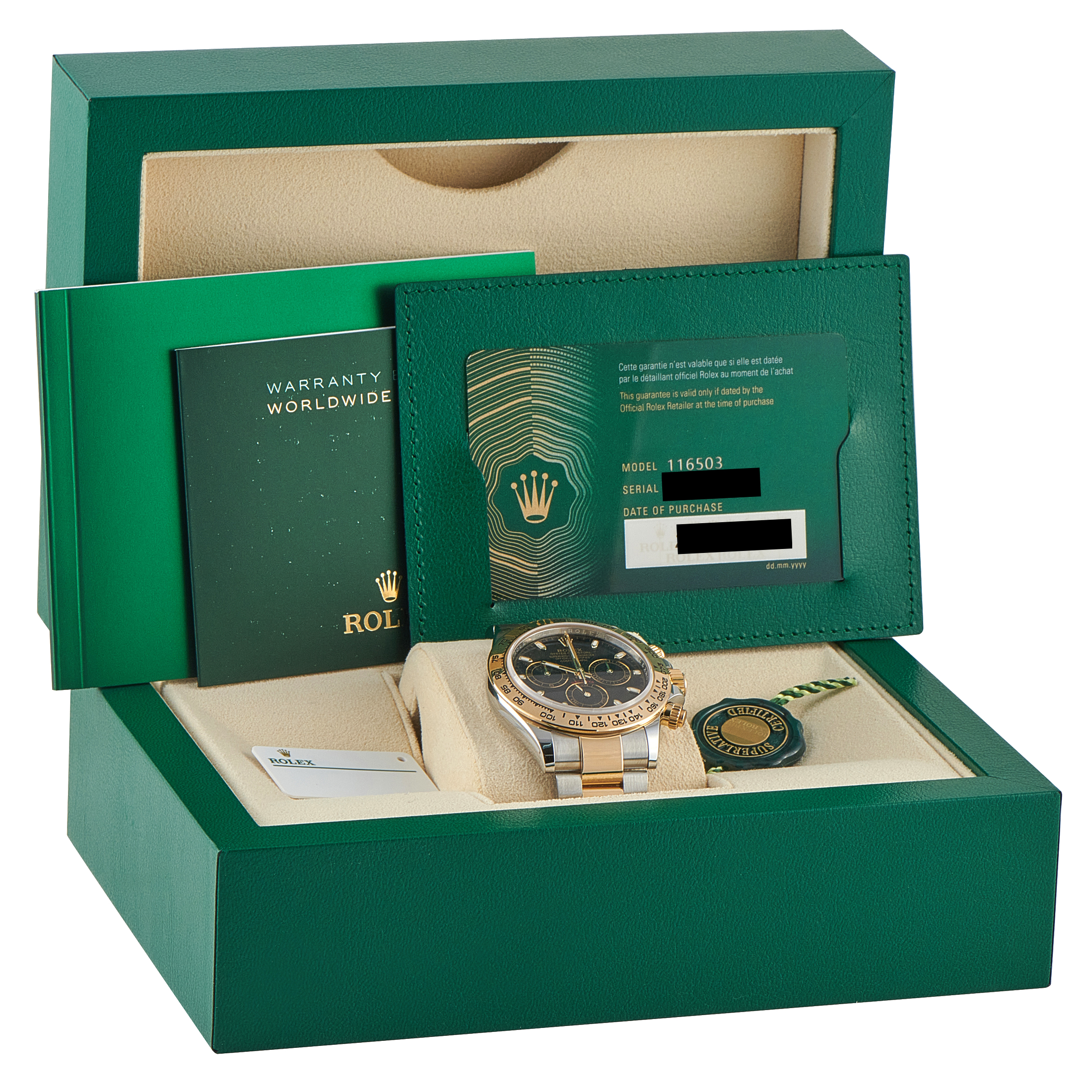 This pre-owned Rolex Cosmograph Daytona Black Dial Two-Tone Watch 116503 comes with the original manufacturer’s packaging and all associated paperwork.
