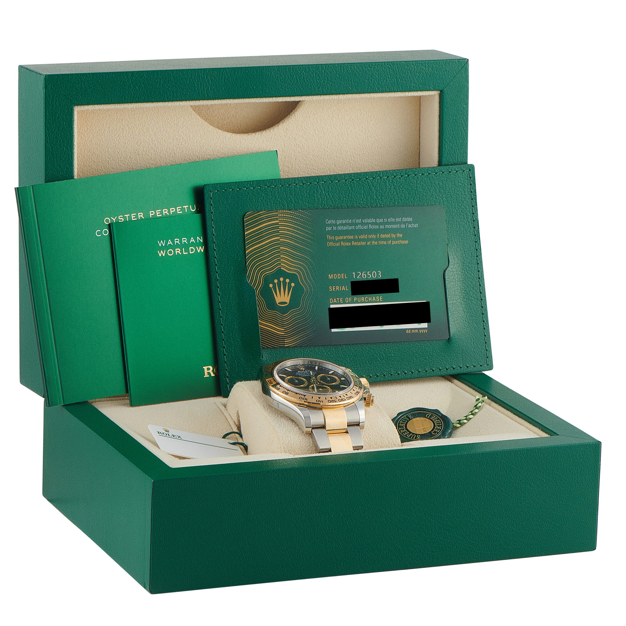 This is a pre-owned Rolex Cosmograph Daytona Black Dial Yellow Rolesor Watch 126503-0003. It comes complete with papers and the manufacturer’s box.