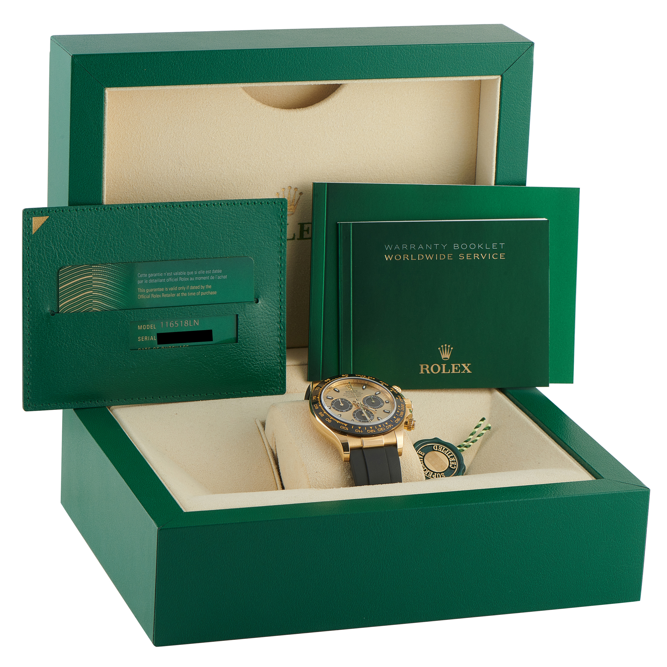 Offered unworn, this Rolex Cosmograph Daytona Champagne-Black Dial 18K Yellow Gold on Oysterflex Watch 116518LN comes complete with papers and the manufacturer’s box.