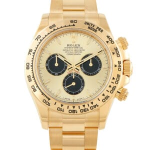 A statement in full 18K yellow gold, this particular Rolex Cosmograph Daytona ref. 126508-0006 marks the wrist with unmistakable presence. Its gold dial with black chronograph subdials introduces a sharp contrast and clarity, while the self-winding caliber 4131 inside delivers accuracy and reliability expected of the modern Daytona.