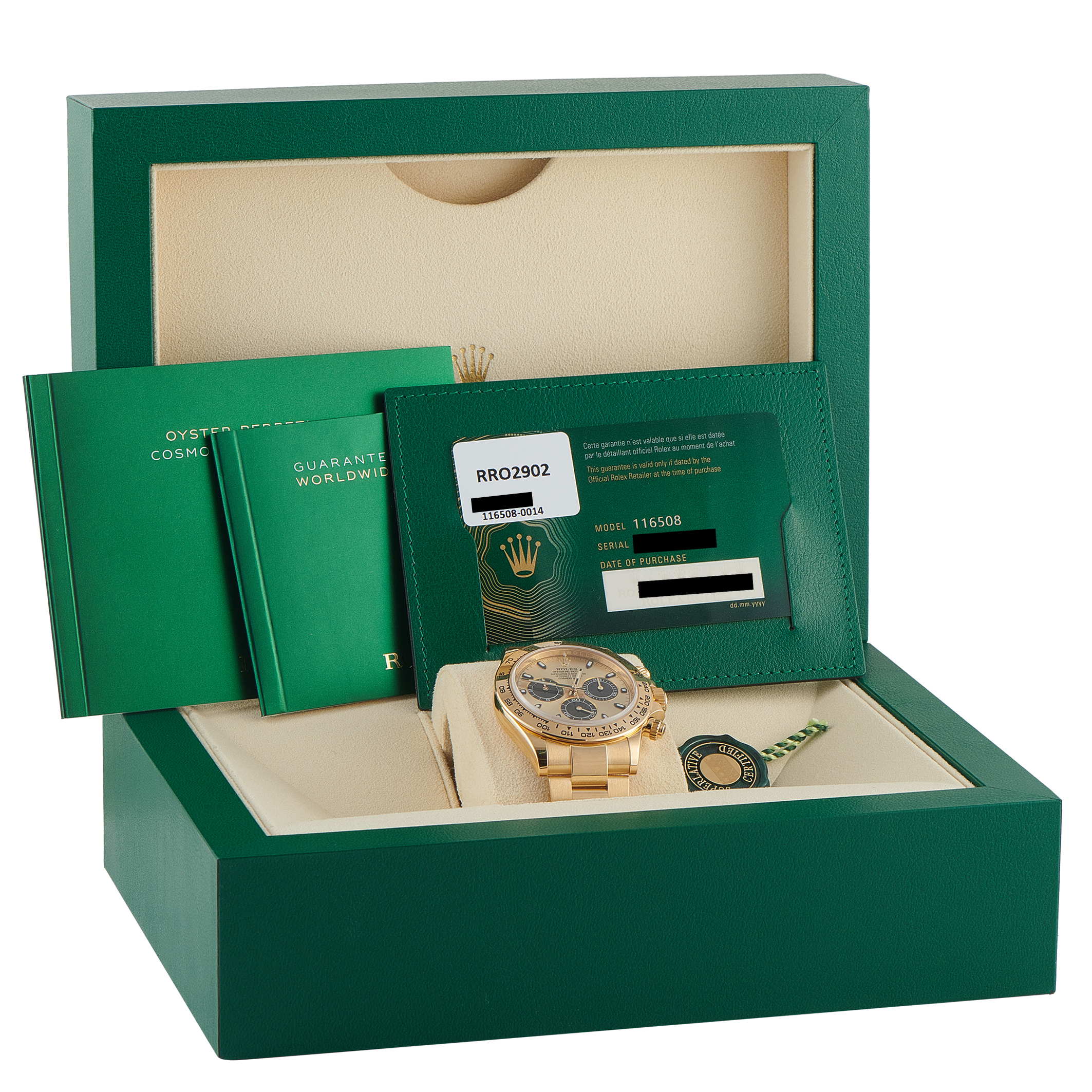 A statement in full 18K yellow gold, this particular Rolex Cosmograph Daytona ref. 126508-0006 marks the wrist with unmistakable presence. Its gold dial with black chronograph subdials introduces a sharp contrast and clarity, while the self-winding caliber 4131 inside delivers accuracy and reliability expected of the modern Daytona.