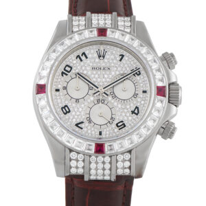 The Rolex Cosmograph Daytona 18K White Gold Watch, reference number 116599, makes a statement thanks to sparkling factory set diamonds and rubies.
