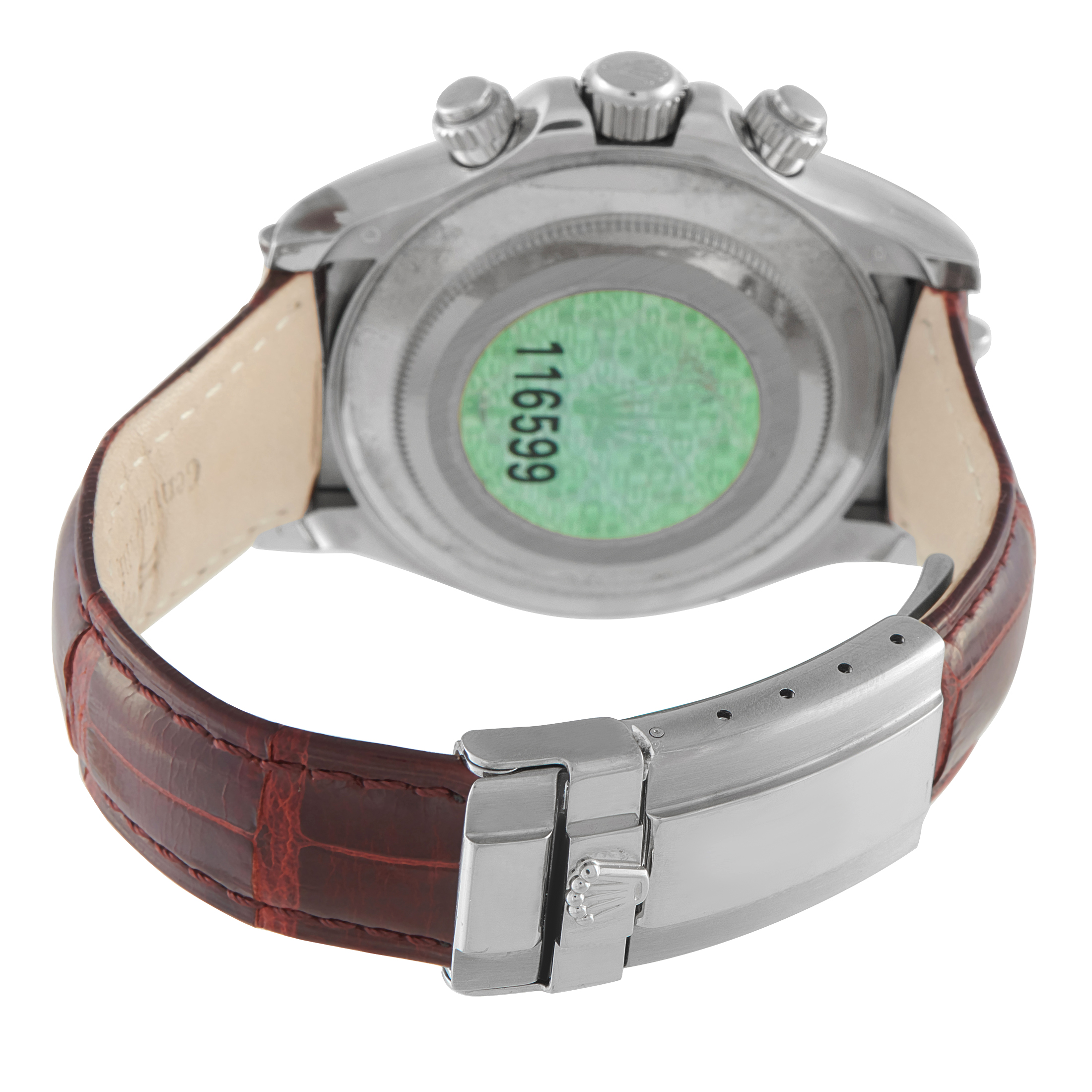 On this exquisite timepiece, the 40mm 18K White Gold Diamond-set case is further elevated by a diamond-set bezel surrounding a pave diamond dial with four ruby accents – which complement the striking burgundy alligator strap. On the sparkling diamond dial, you’ll find silver toned hands, Arabic numeral hour markers, and a trio of chronograph subdials. It’s powered by an automatic Rolex Calibre 4130 movement with 72 hours of reserve time and is water resistant up to 100 meters.