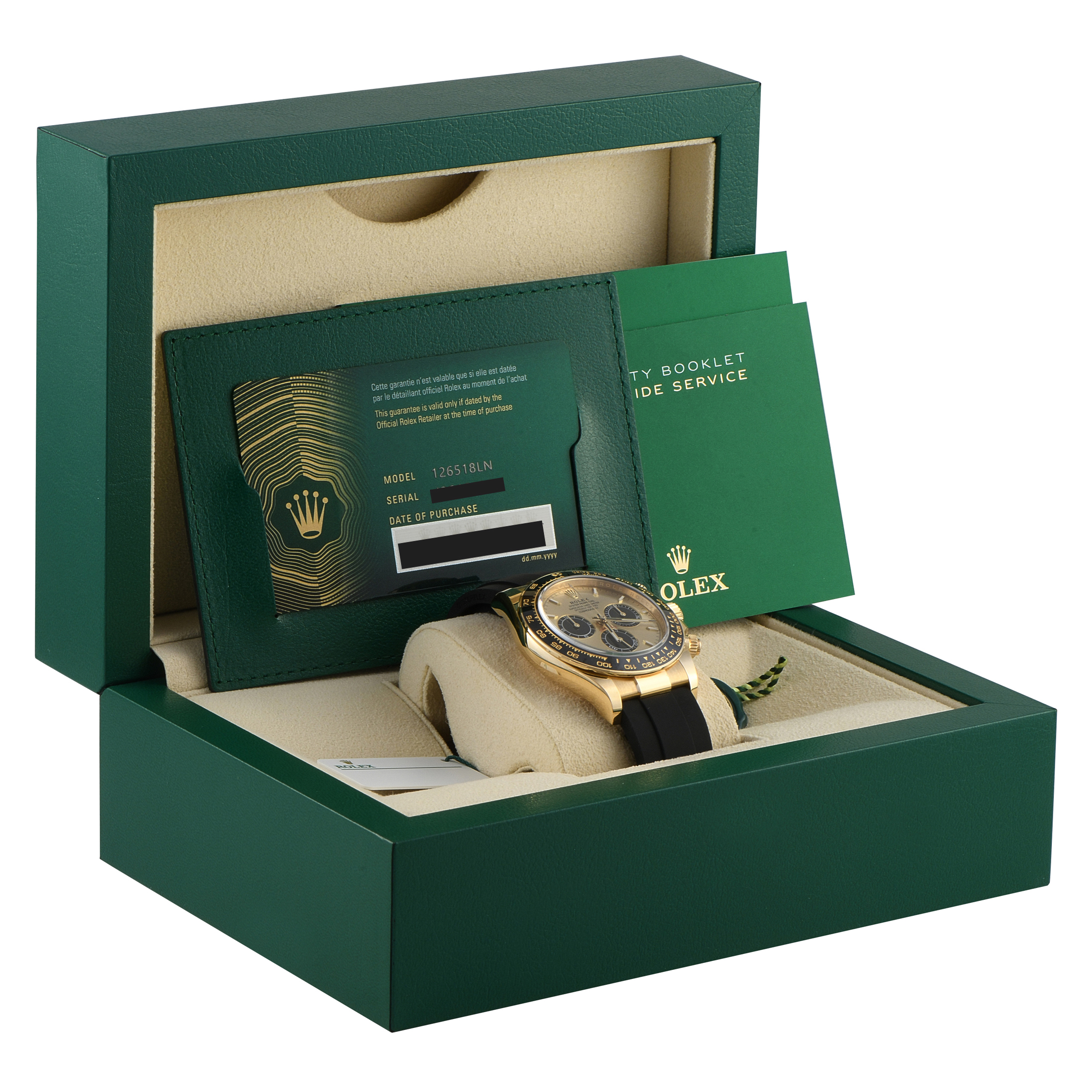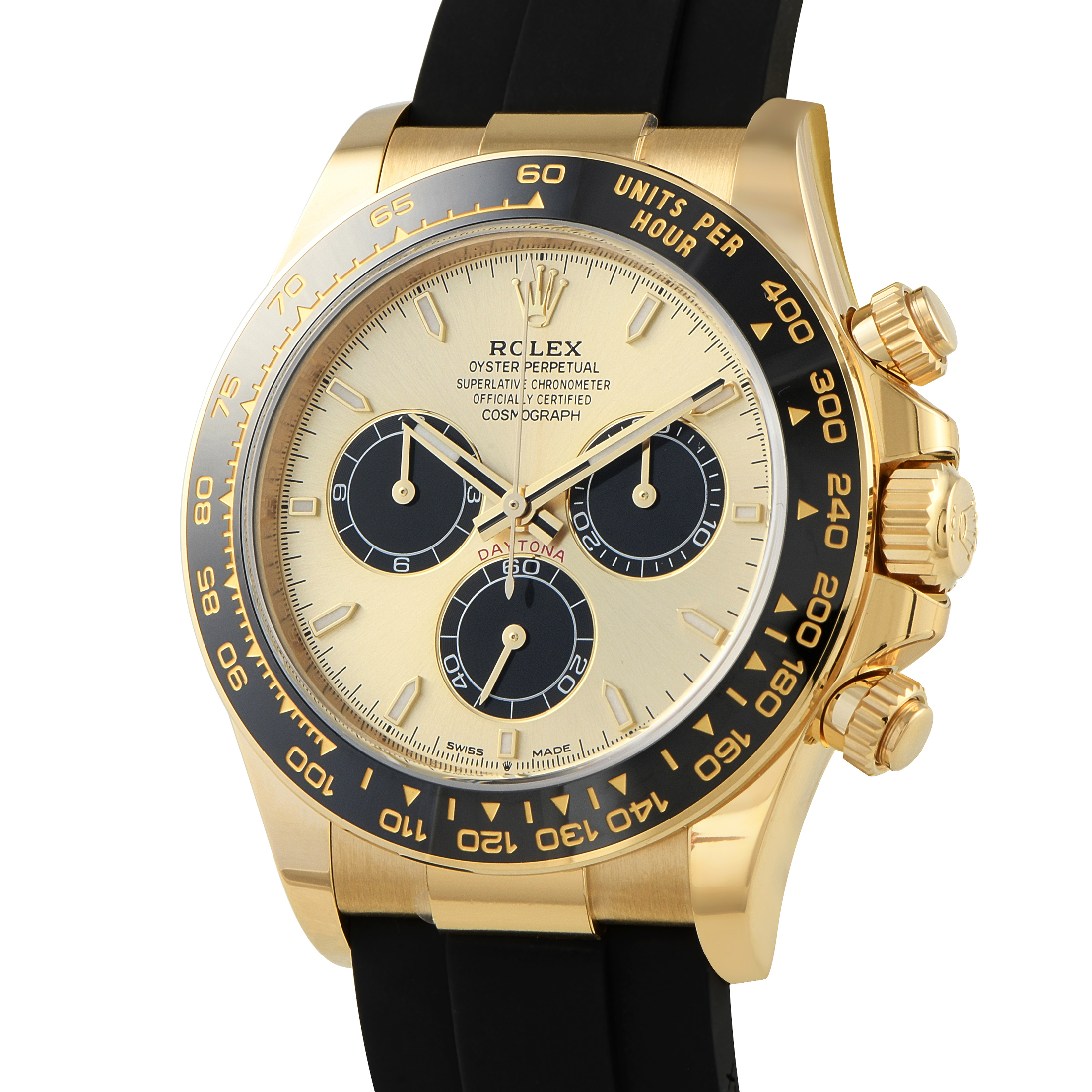 The Rolex Cosmograph Daytona ref.126518LN perfectly represents precision, performance, and prestige. Its 40mm case is cast in luxurious 18K yellow gold. The watch is worn on a Rolex Oysterflex bracelet, a practical, durable, and comfortable option for wearers who lead an active lifestyle. A black Cerachrom bezel frames this watch’s classic golden dial with luminous hour markers and hands, and bright black chronograph counters.