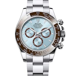 The Rolex Cosmograph Daytona 126506, nicknamed the “Platona,” is one of the most difficult watches to acquire from an authorized Rolex dealer, despite its extravagant price tag. Crafted from .950 platinum, this timepiece features a striking chestnut brown Cerachrom bezel insert, offering supreme scratch resistance along with a nice contrast to its ice blue dial. The iconic Oyster bracelet, also made of solid platinum, ensures a secure and comfortable fit thanks to its Easy Link clasp.