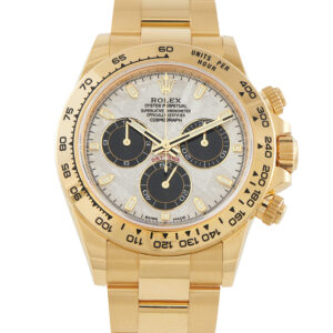 The highly sought-after Rolex Cosmograph Daytona ref.116508 is, without a doubt, a symbol of prestige in the watch world. It is rendered in full 18K yellow gold, gleaming with enduring elegance. Its meteorite and black dial is detailed with and gold hour markers with luminous fill, blackened hands with luminous tips, and a trio of black chronograph counters. Encircling the dial is a fixed yellow gold bezel engraved with a tachymeter scale to measure speeds up to 400 units per hour.