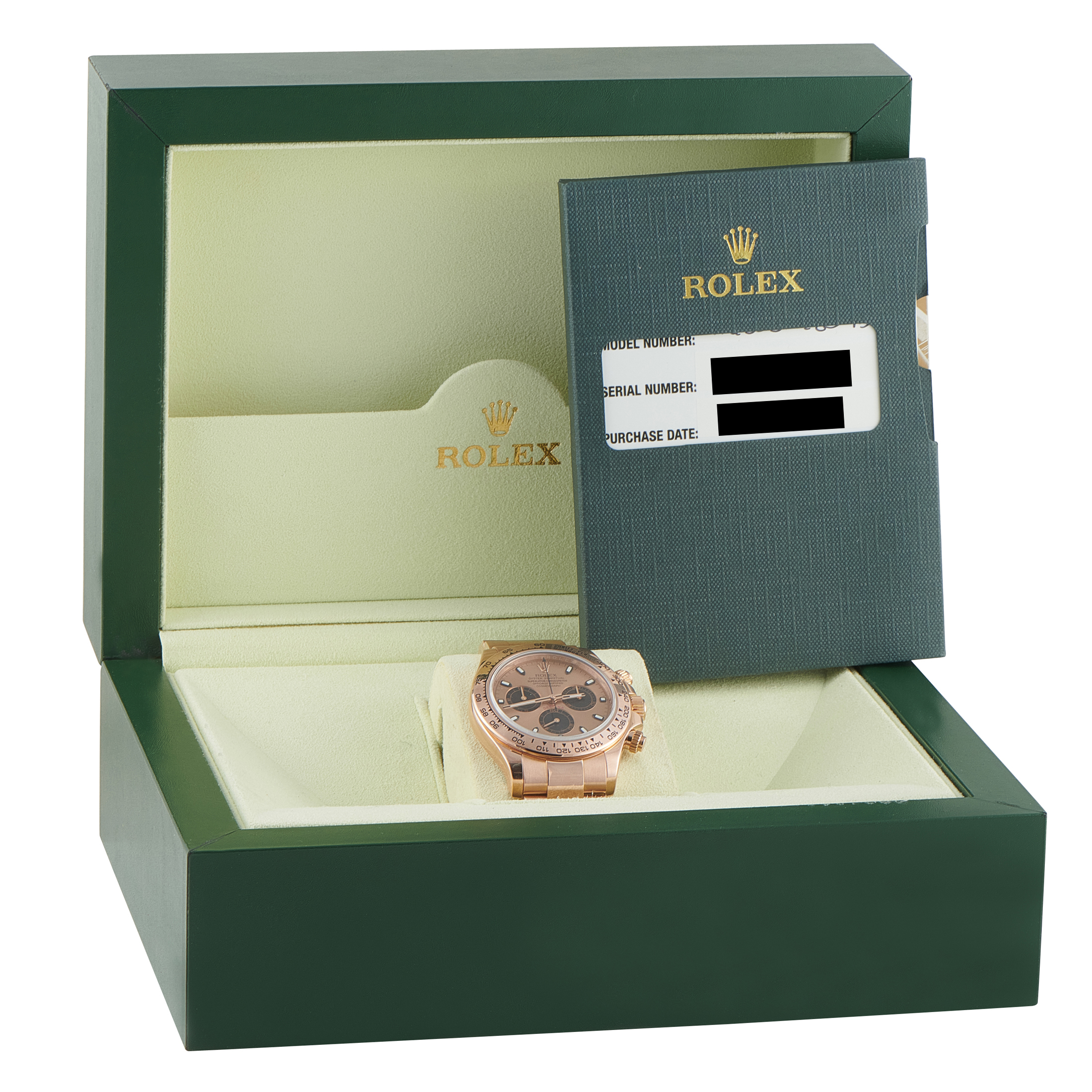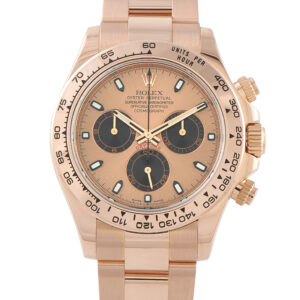 This pre-owned Rolex Daytona Rose Dial 18K Everose Gold Watch 116505 includes the manufacturer’s box and papers.