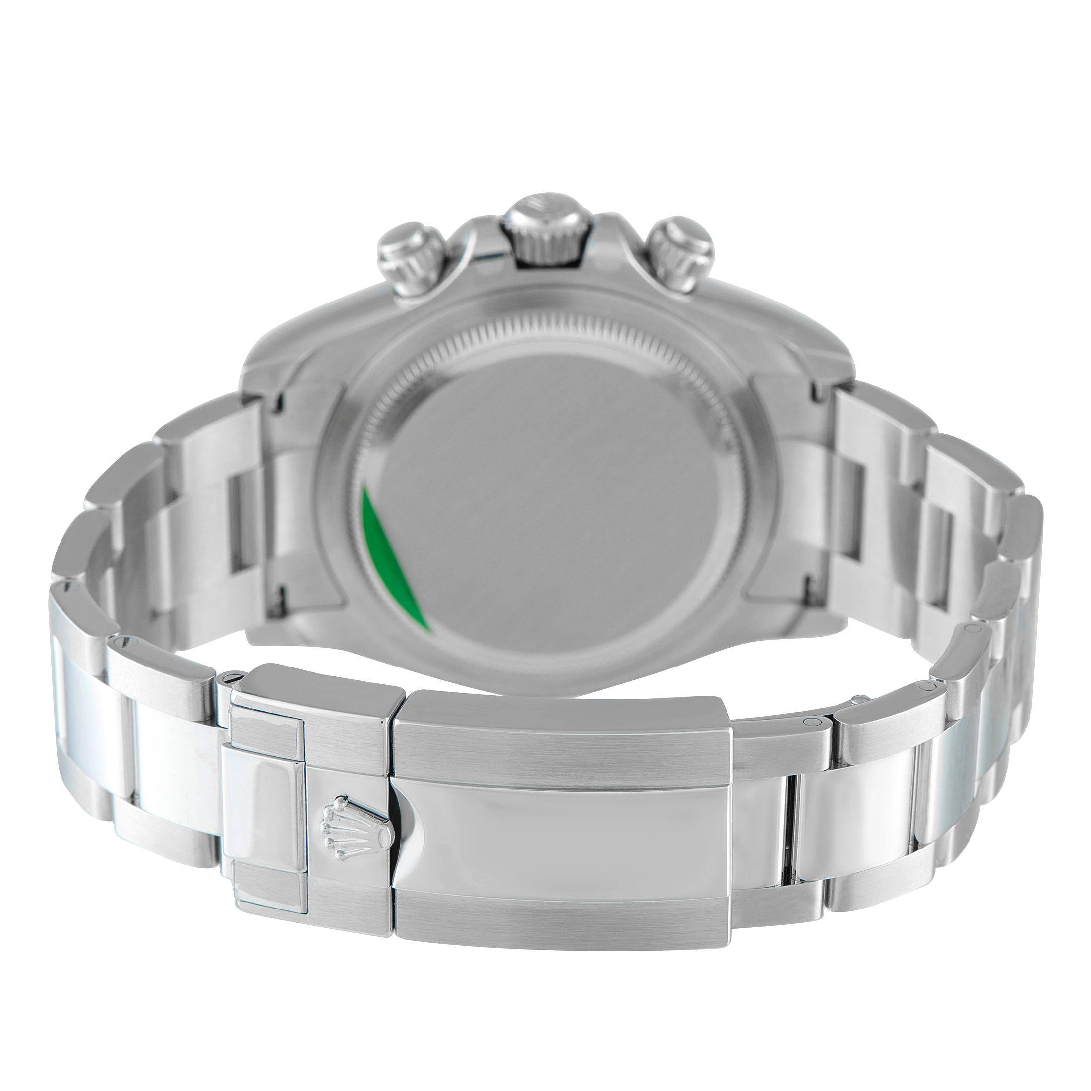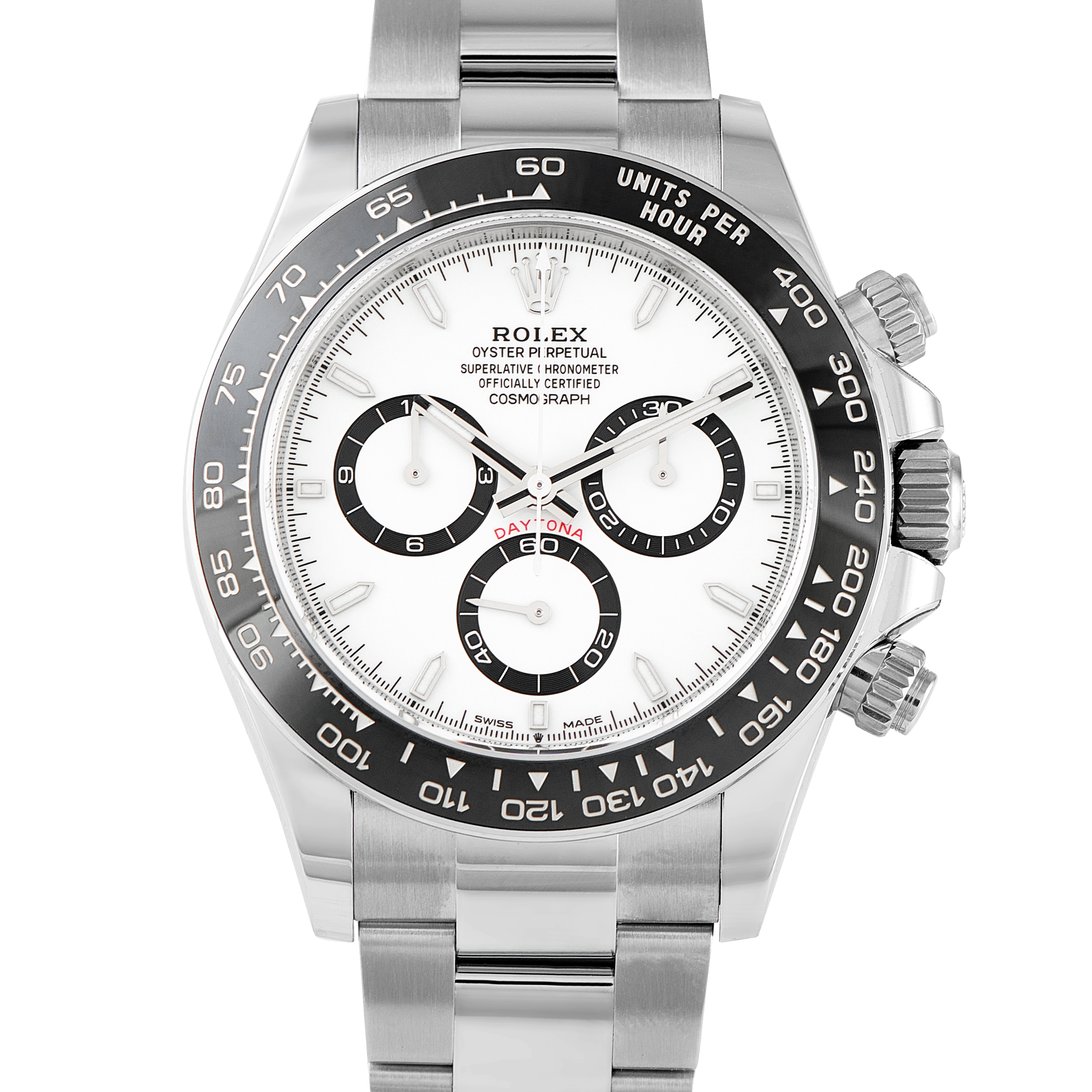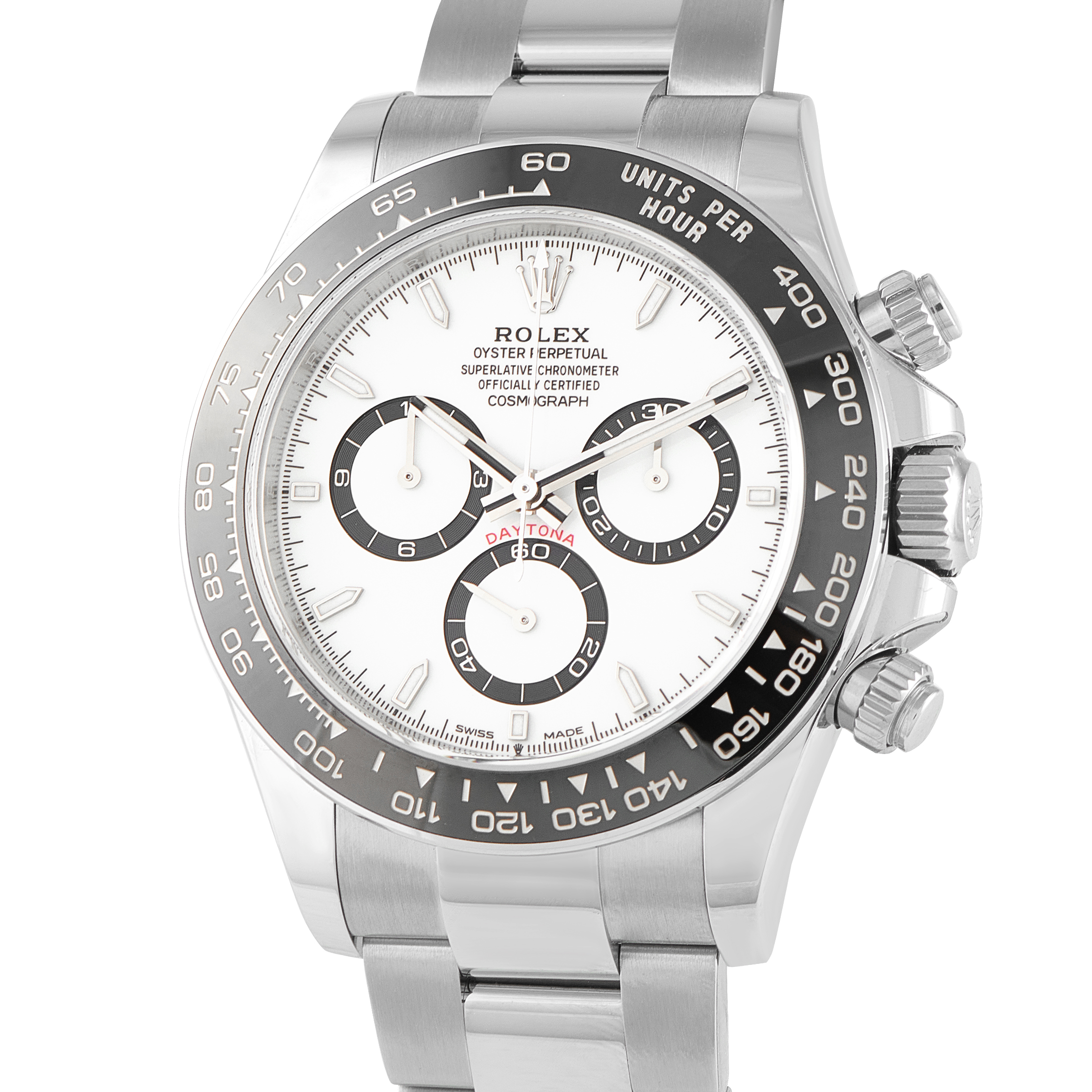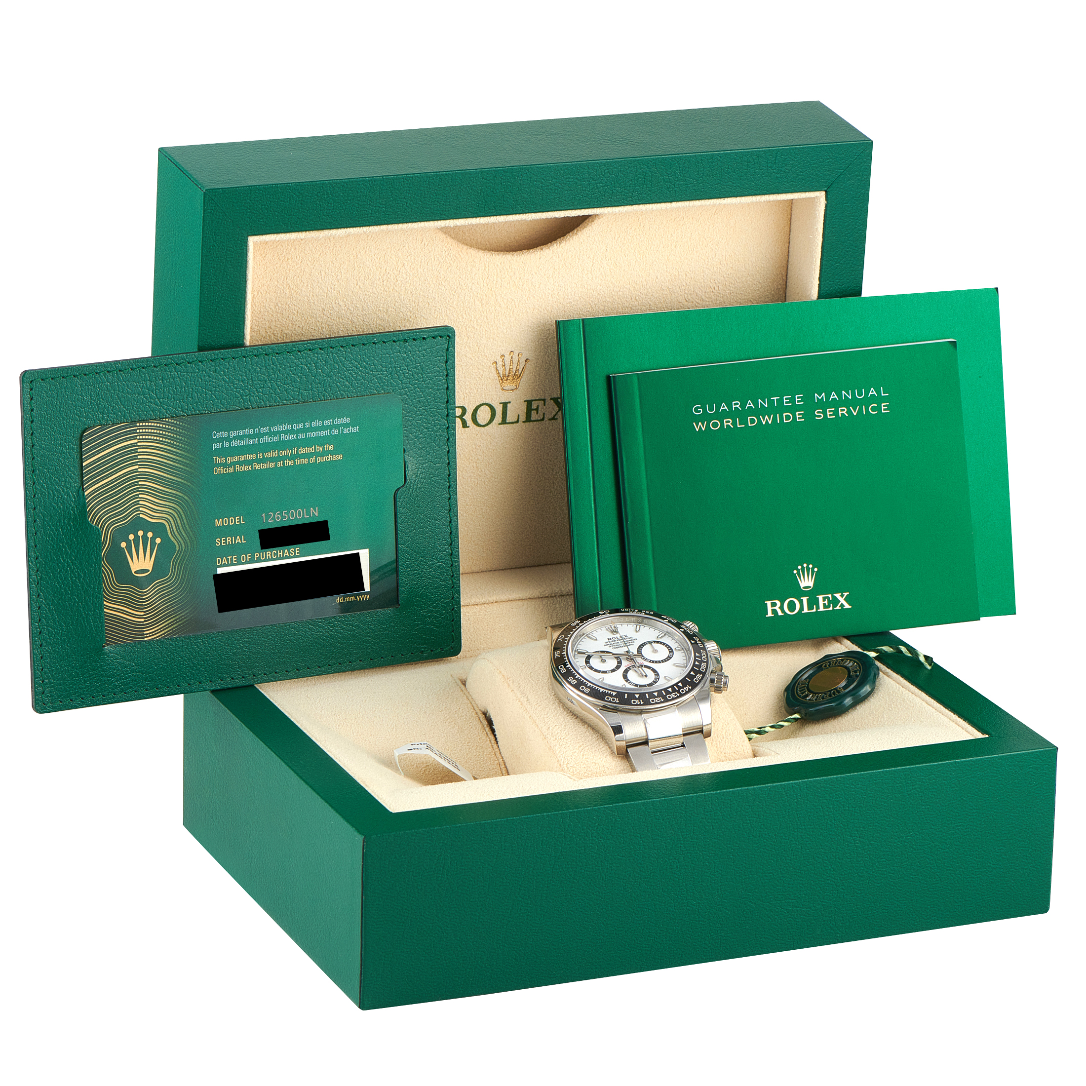This is an unworn Rolex Cosmograph Daytona White Dial Oystersteel Watch 126500LN. It is accompanied by papers and the manufacturer’s box.