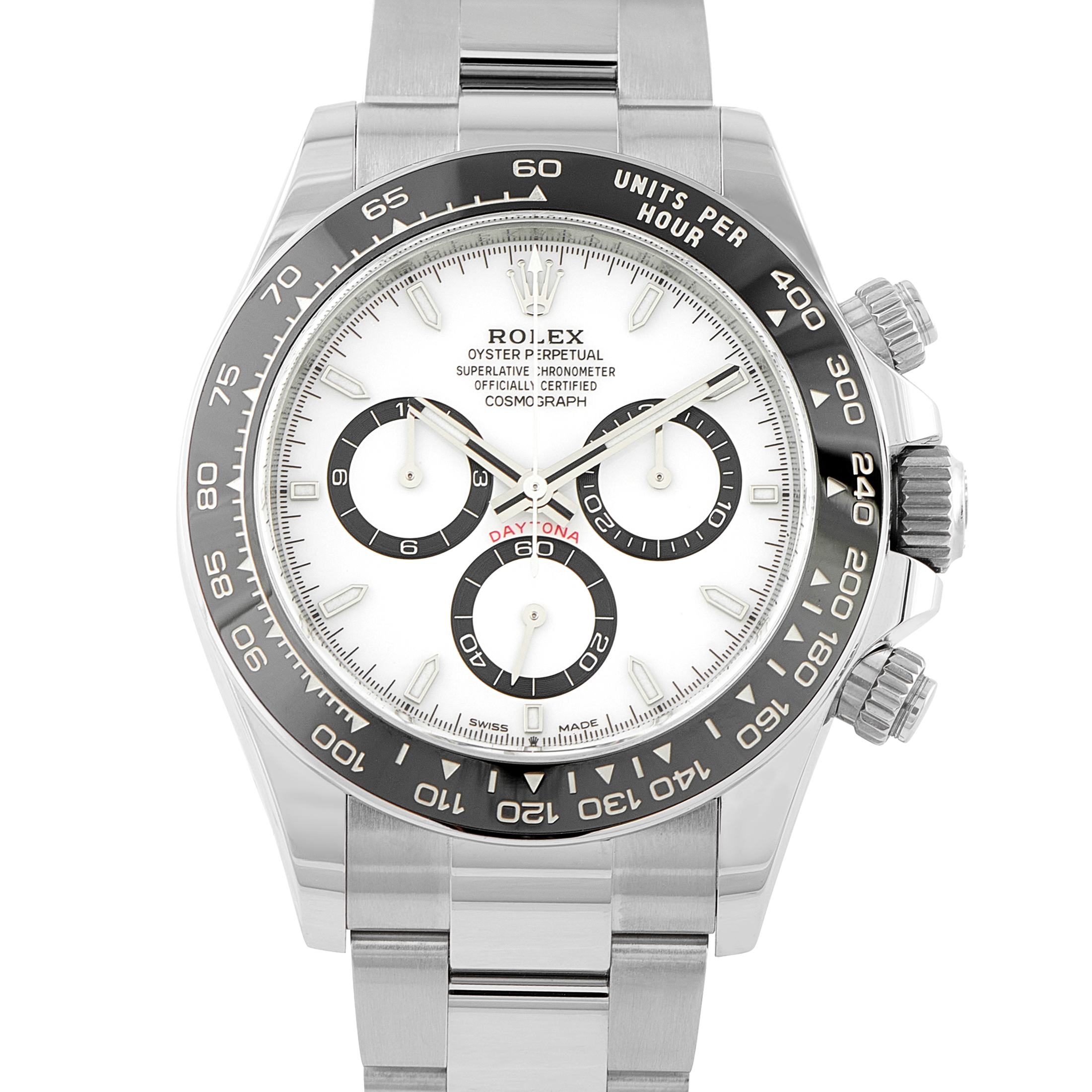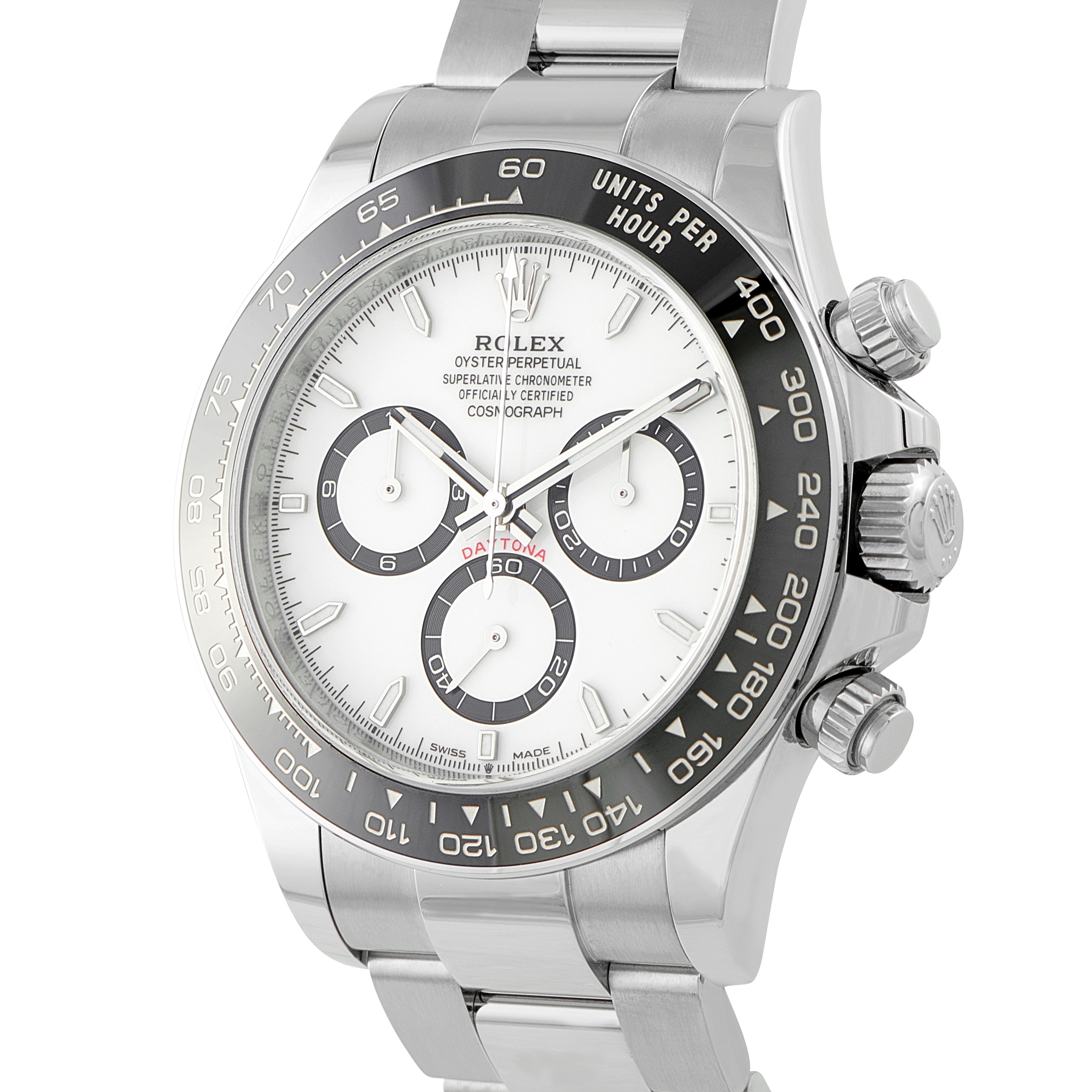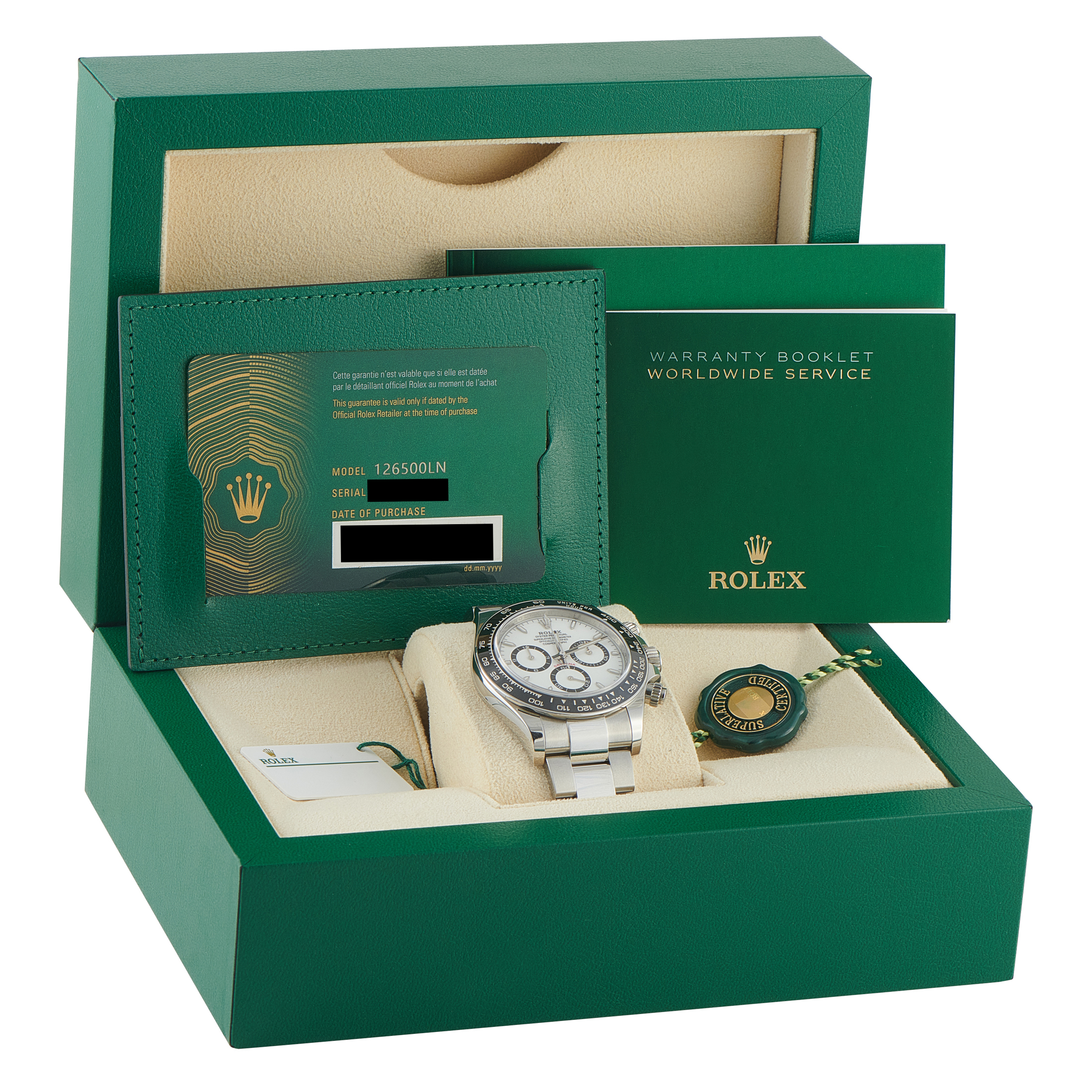 Offered pre-owned, this Rolex Cosmograph Daytona White Dial Chronograph Watch 126500LN comes with papers and the manufacturer’s box.