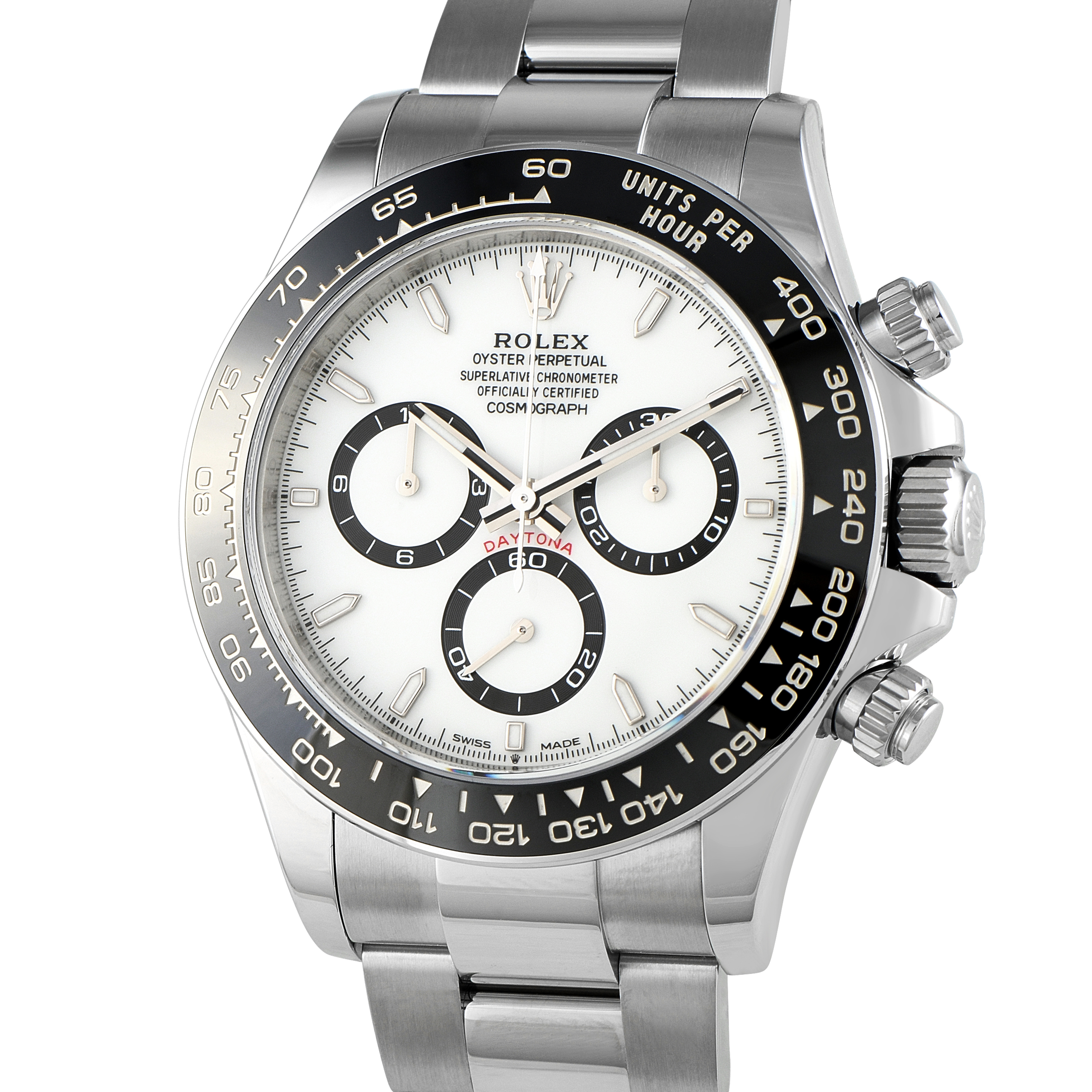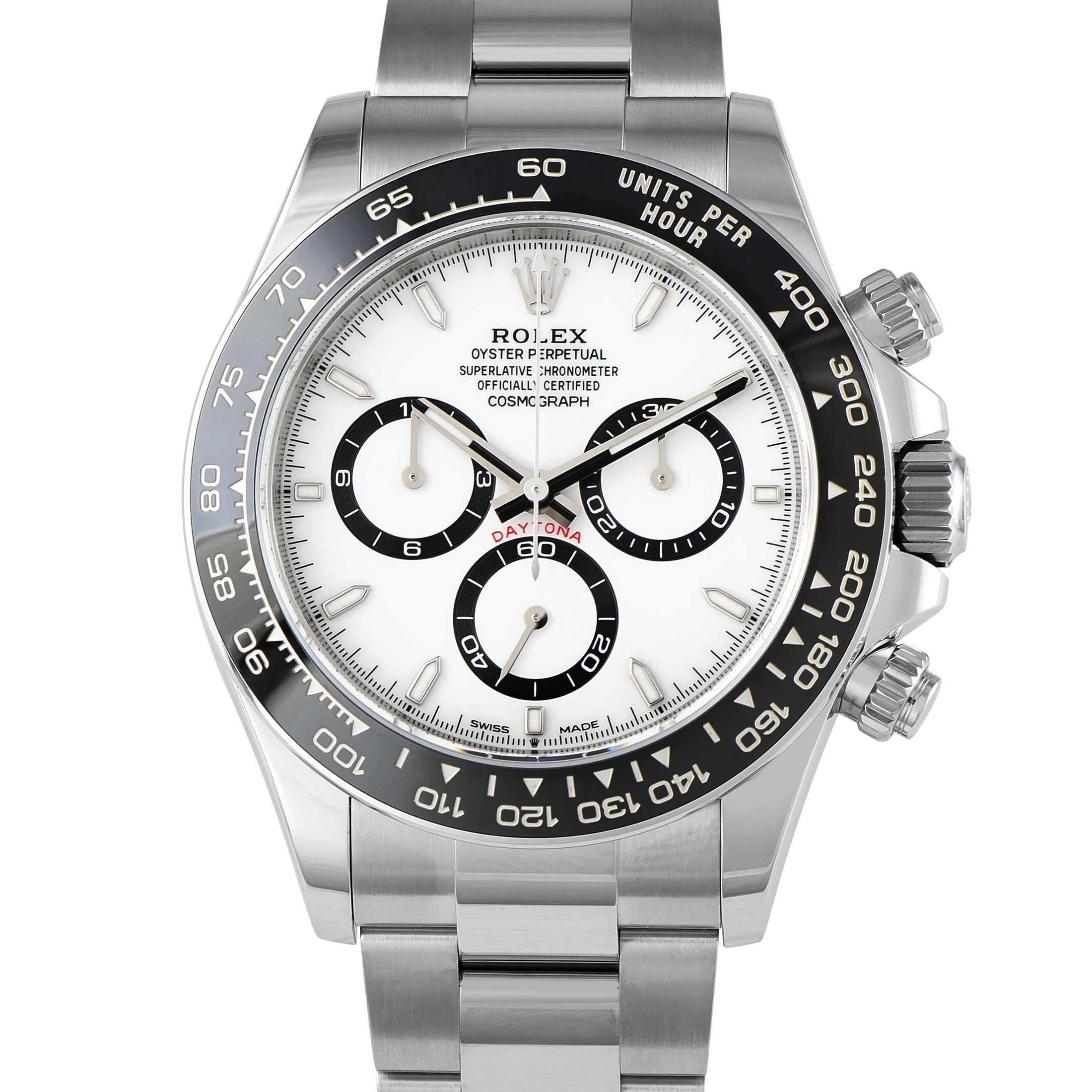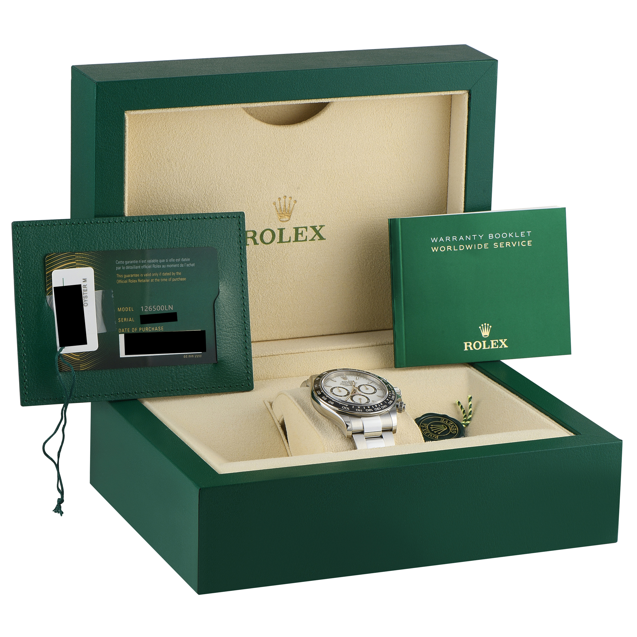 This is an unworn Rolex Cosmograph Daytona White Dial Oystersteel Watch 126500LN. It is accompanied by papers and the manufacturer’s box.