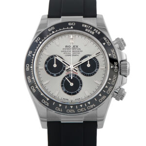 The Rolex ref. 126519LN presents the Cosmograph Daytona in 18K white gold and Oysterflex, blending precious metal weight with a restrained exterior. The 40mm case is framed by a black Cerachrom bezel and houses a high-contrast silver dial. Applied white gold markers, luminous hands, and crisply defined black chronograph registers allow the time and elapsed readings to be taken in at a glance. The Oysterflex bracelet, with a flexible metal core beneath elastomer, secures the watch firmly while maintaining comfort and stability on the wrist. Power comes from Rolex’s automatic chronograph caliber 4131 with approximately three days of running time from a full wind.