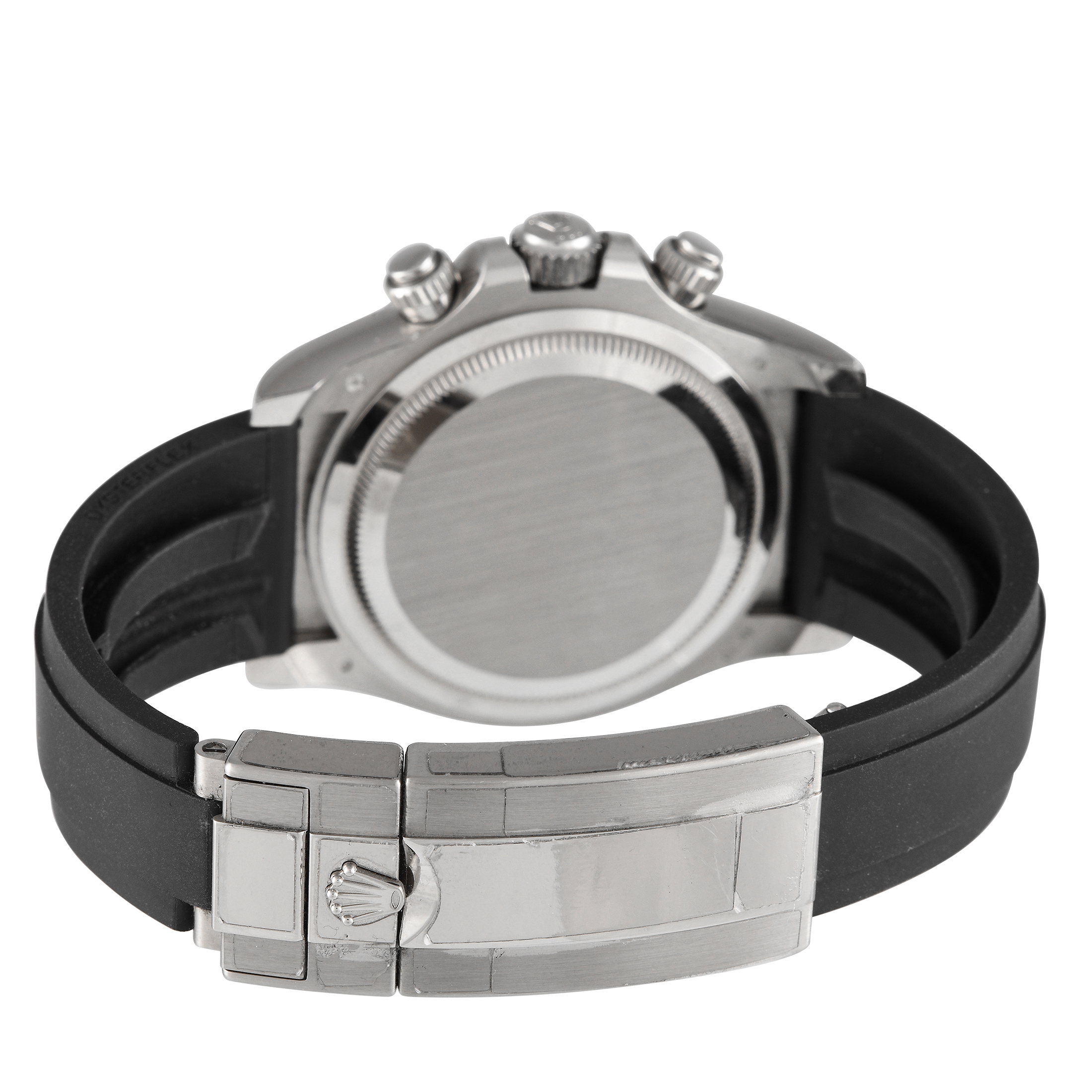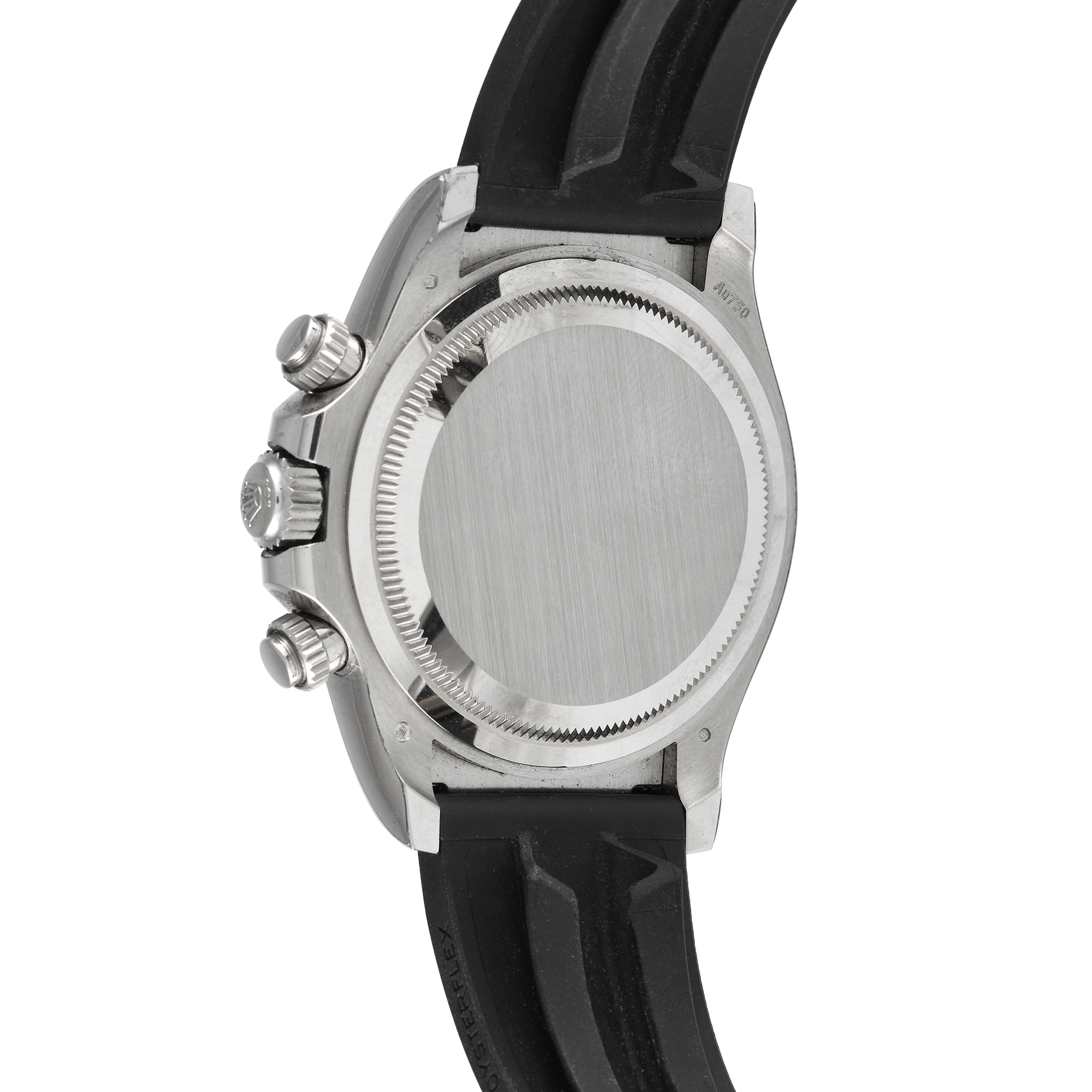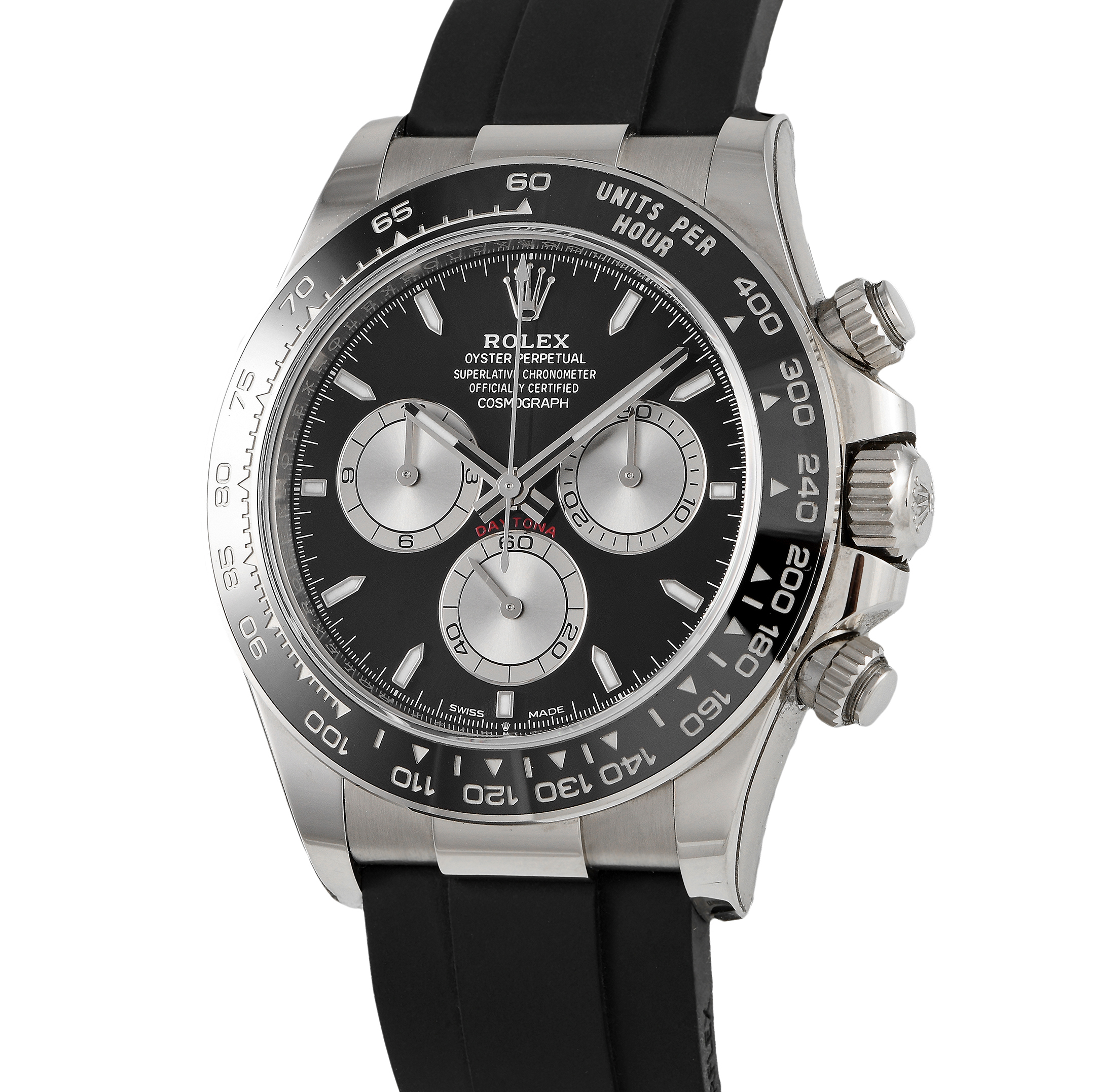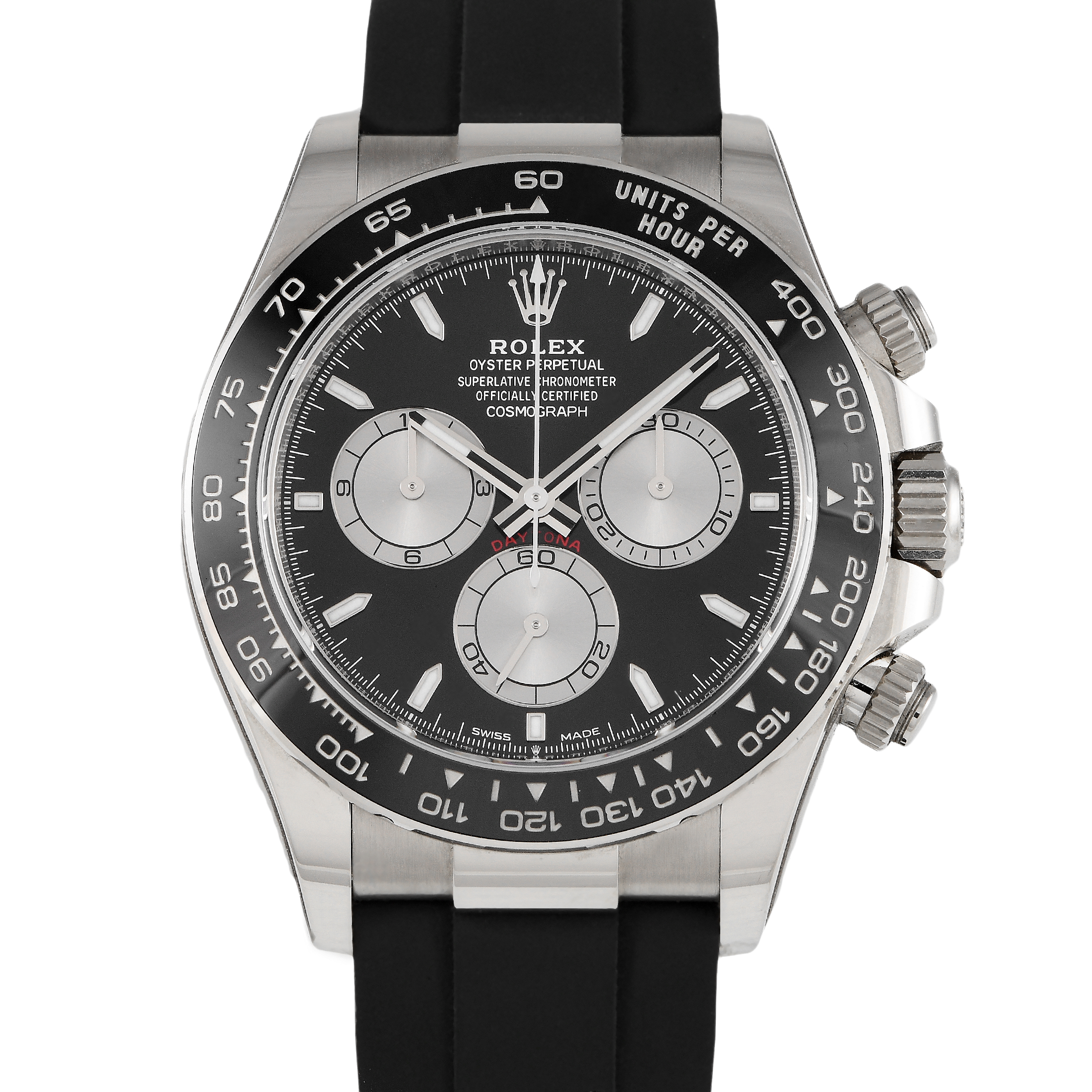 Beguiling in white gold. This 40mm Daytona is an investment timepiece built to impress endlessly. The watch has a bright black face and a black Oysterflex rubber strap complemented by the warm white sheen of a white gold case and a trio of silver-toned sub-dials. This high-performance chronograph runs on caliber 4131 with about 72 hours of power reserve.