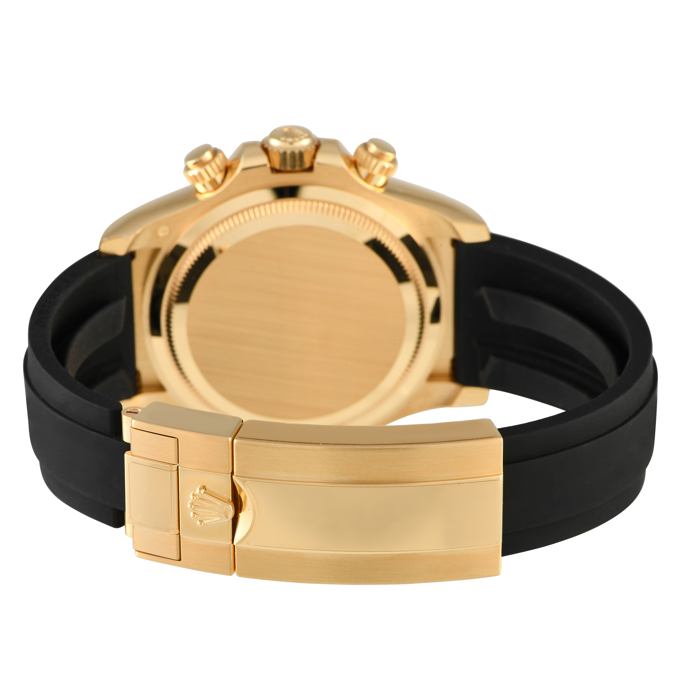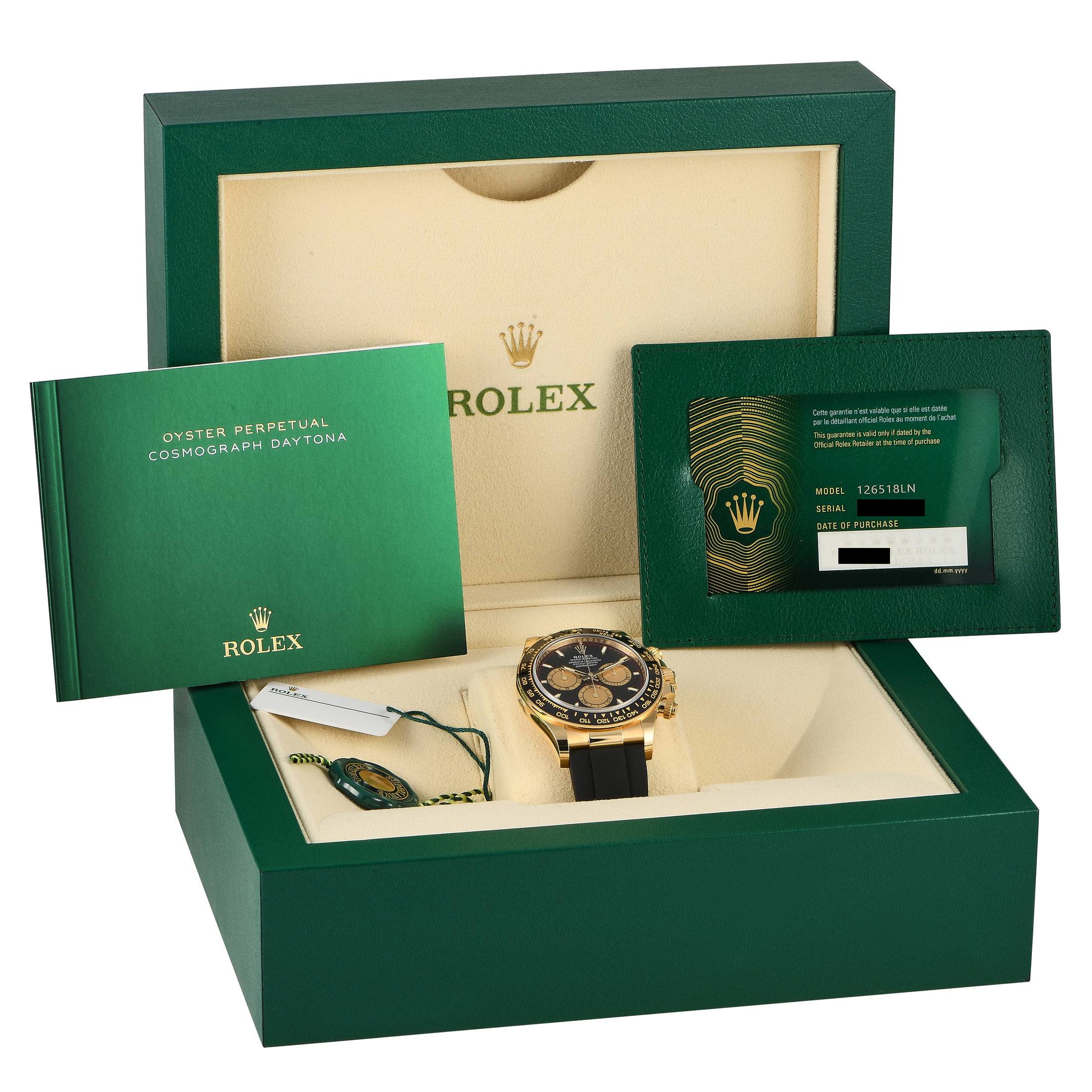 Papers and the manufacturer’s box accompany this unworn Rolex Cosmograph Daytona 18K Yellow Gold on Oysterflex Watch 126518LN.