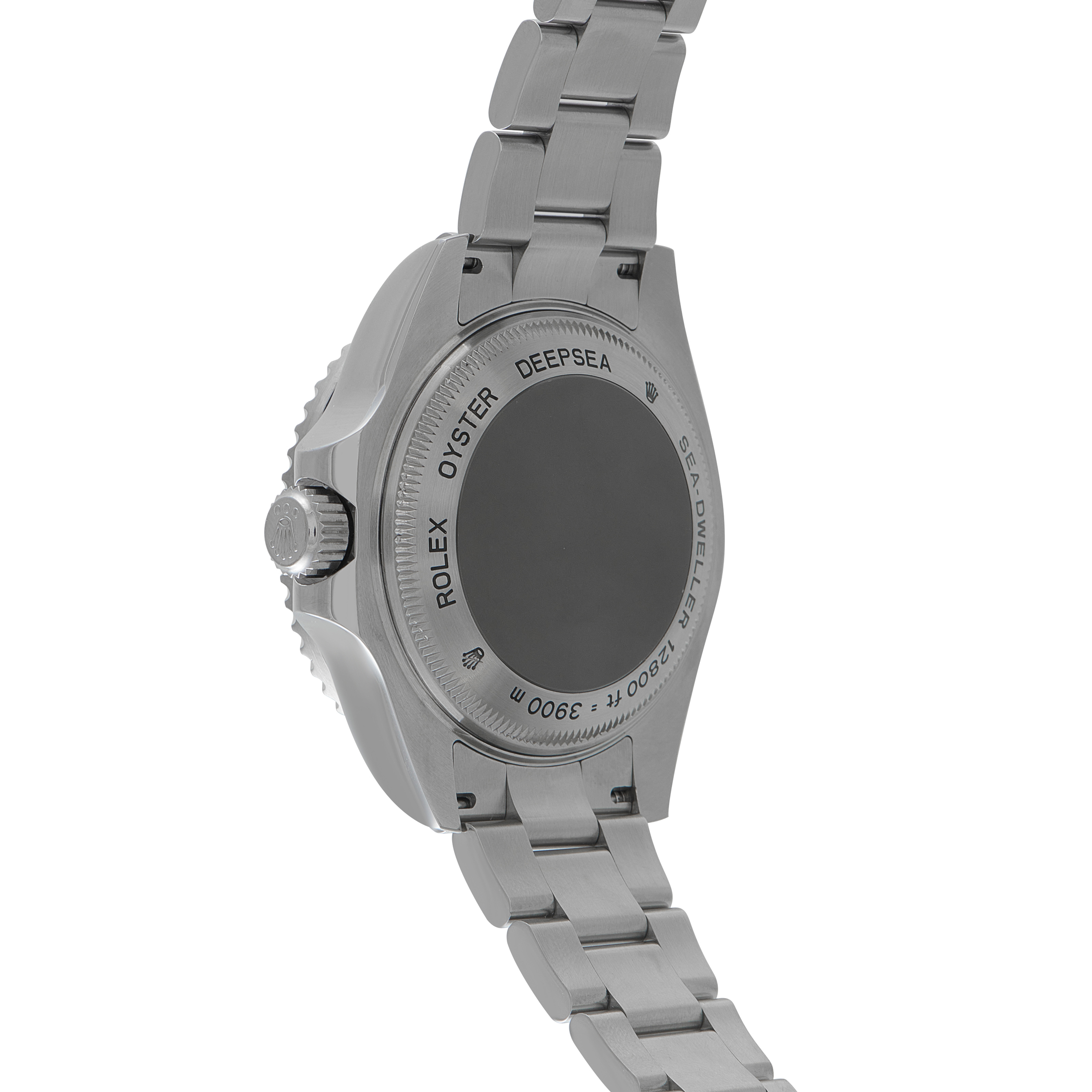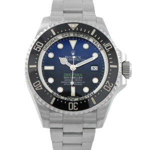 It features a 44mm Oystersteel case, an Oystersteel bracelet, and a unidirectional rotatable 60-minute graduated bezel with a black Cerachrom insert. The most notable feature of this timepiece is the iconic two-color gradient “D-Blue” dial, which transitions from brilliant blue to bottomless black. It provides the perfect backdrop for features like luminous silver toned hands, luminous index markers, and a date dial located at the 3-o-clock position – all meant to remain highly legible to the wearer even on the deepest ocean dives. It’s powered by an automatic Calibre 3235 movement with approximately 70 hours of power reserve time. It’s also waterproof to 3,900 meters and includes a helium escape valve for diving.
