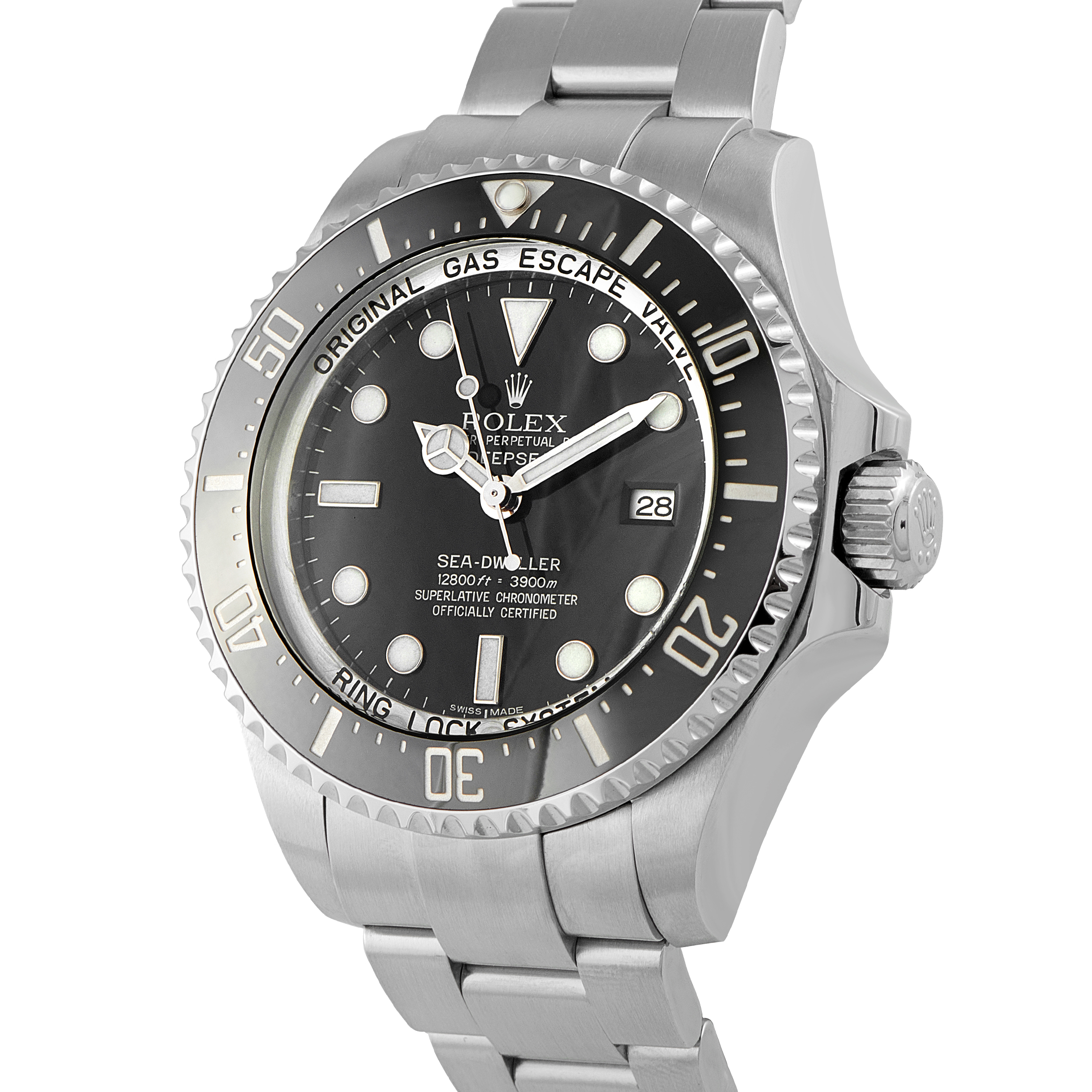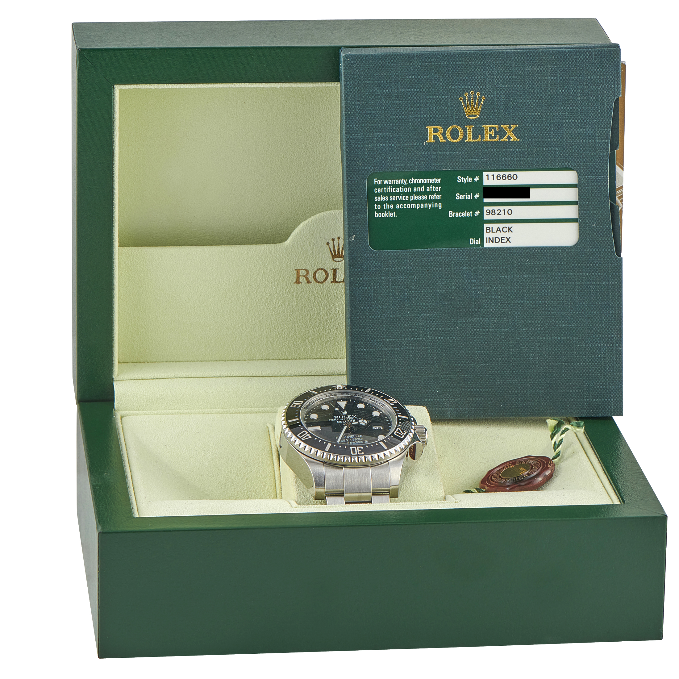 This pre-owned Rolex Deepsea Sea-Dweller Steel Watch 116660 comes with the original manufacturer’s packaging and paperwork.