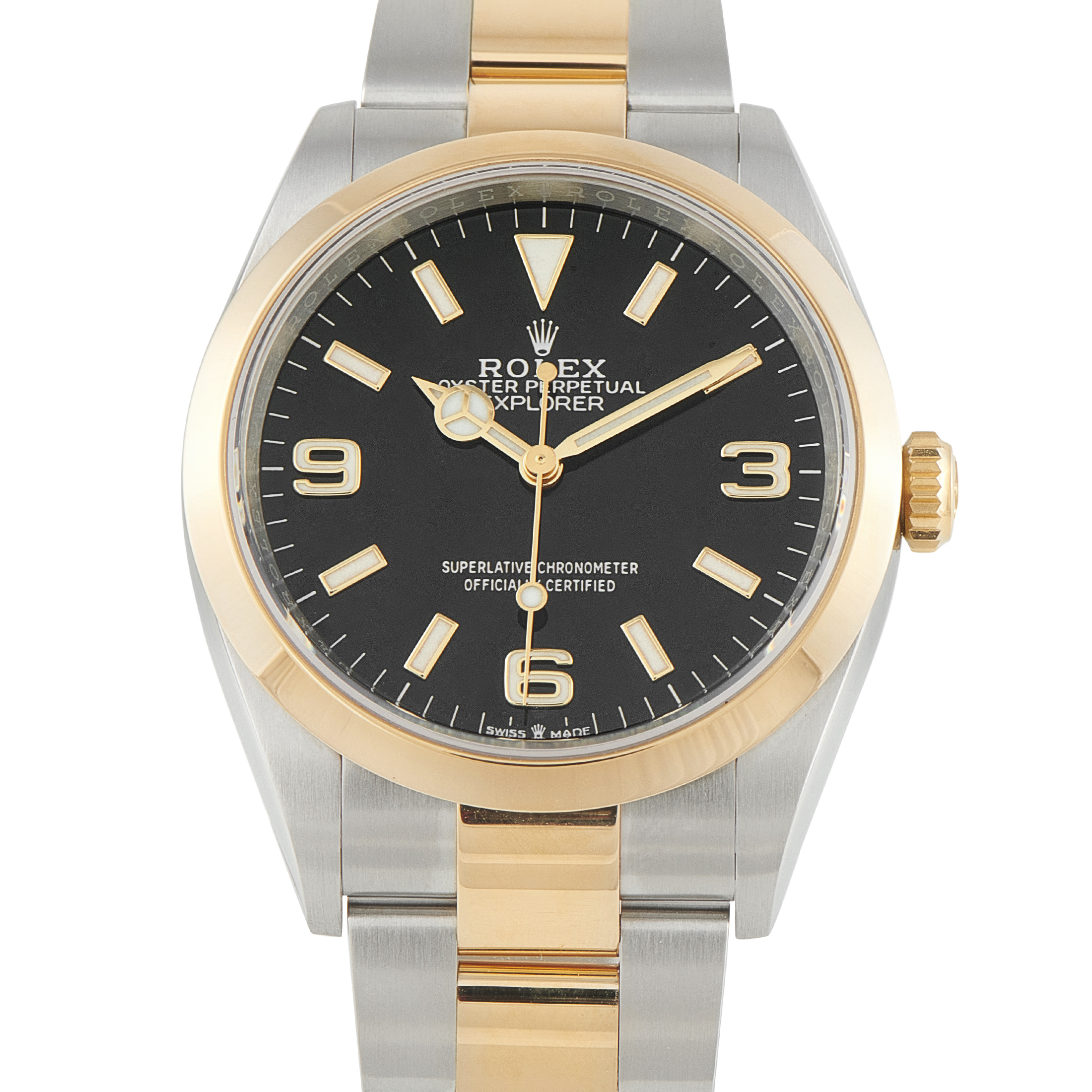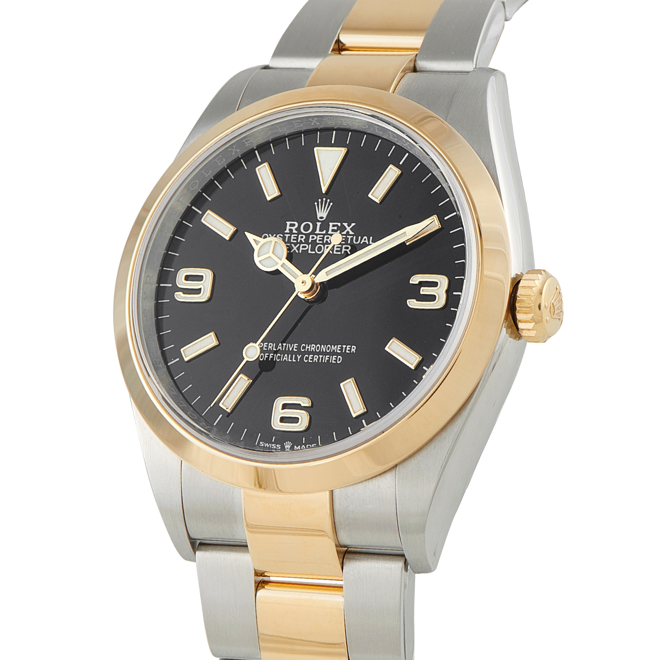 Classic Explorer form, now in two-one. In 2021, Rolex introduced the first-ever Yellow Rolesor option for the model long known for its all-steel build. The 36mm case keeps its compact proportions, matched with a smooth bezel in yellow gold. The black dial remains unchanged in layout, with bold 3-6-9 numerals, high-visibility markers, and Mercedes hands for clear reading in any light. The Oyster bracelet carries steel outer links with yellow gold through the center. The self-winding Caliber 3230 runs inside with a 70-hour power reserve and steady, precise timekeeping.