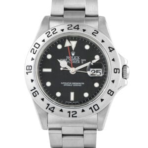Ref. 16570, the third iteration of Rolex’s Explorer II model, replaced the 16550 in the late 1980’s. Its trusty caliber 3185 movement offers 42 hours of power reserve while the brushed stainless steel case provides 100 meters of water resistance. Its fixed 24-hour bezel is also brushed, along with its steel Oyster bracelet. These brushed finishes, and classic 40mm case size, make the 5-digit Explorer II a popular choice among Rolex fans who want a sports model with a little less flash. The 16570 was discontinued in 2011. Note that later versions (roughly 2007-2011) are likely to have engraved rehauts and 3186 caliber movements.