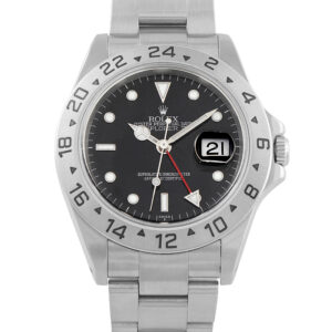 Ref. 16570, the third iteration of Rolex’s Explorer II model, replaced the 16550 in the late 1980’s. Its trusty caliber 3185 movement offers 42 hours of power reserve while the brushed stainless steel case provides 100 meters of water resistance. Its fixed 24-hour bezel is also brushed, along with its steel Oyster bracelet. These brushed finishes, and classic 40mm case size, make the 5-digit Explorer II a popular choice among Rolex fans who want a sports model with a little less flash. The 16570 was discontinued in 2011. Note that later versions (roughly 2007-2011) are likely to have engraved rehauts and 3186 caliber movements.