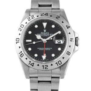The Rolex Explorer II ref. 16570 is a timeless example of what a tool watch is meant to be. Tough, straightforward, and reliable, this timepiece’s design prioritizes legibility, functionality, and durability over ornamentation. The 40mm case, bracelet, fixed 24-hour bezel, lugs, and crown are all made from Rolex’s high-performance steel alloy, Oystersteel. The black dial features luminous hour markers and hands, a magnified date window, and a red GMT hand with a luminous triangle tip. Powering the watch is the Swiss-made automatic caliber 3185, a well-proven movement known for its dependability, precision, and smooth GMT functionality.