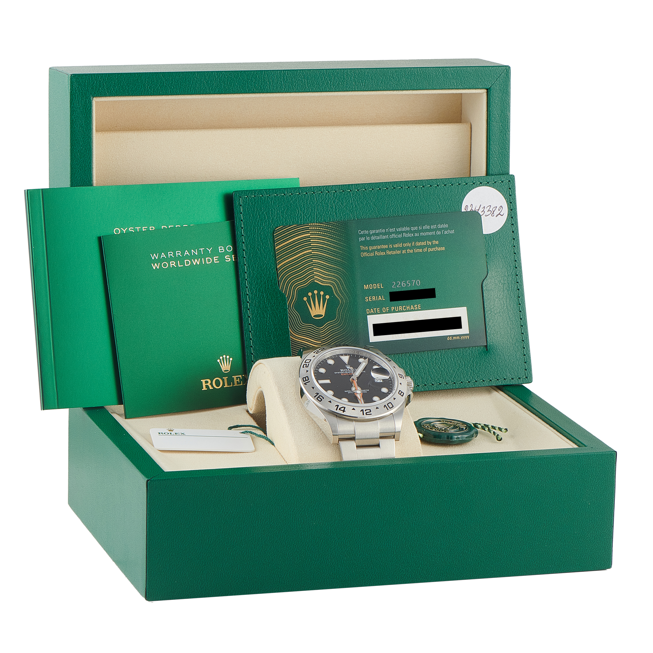 This unworn Rolex Explorer II Oystersteel Watch 226570 comes with papers and the manufacturer’s box.