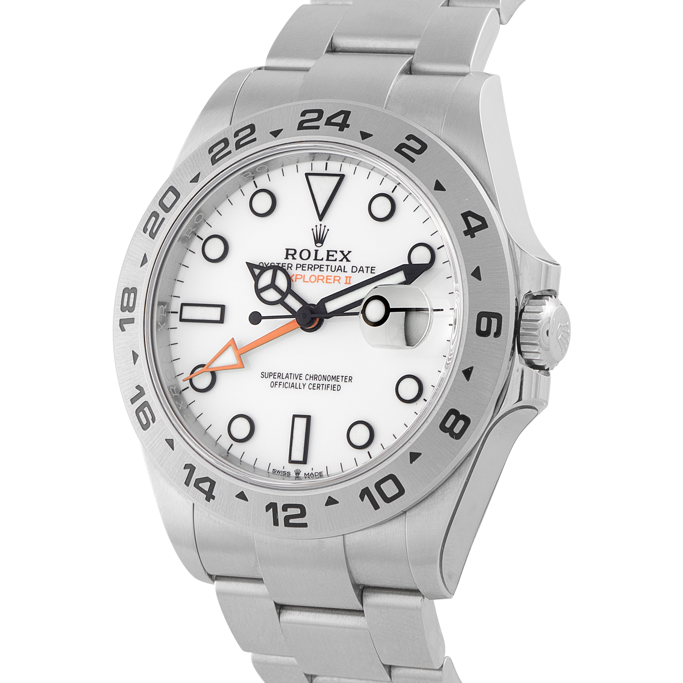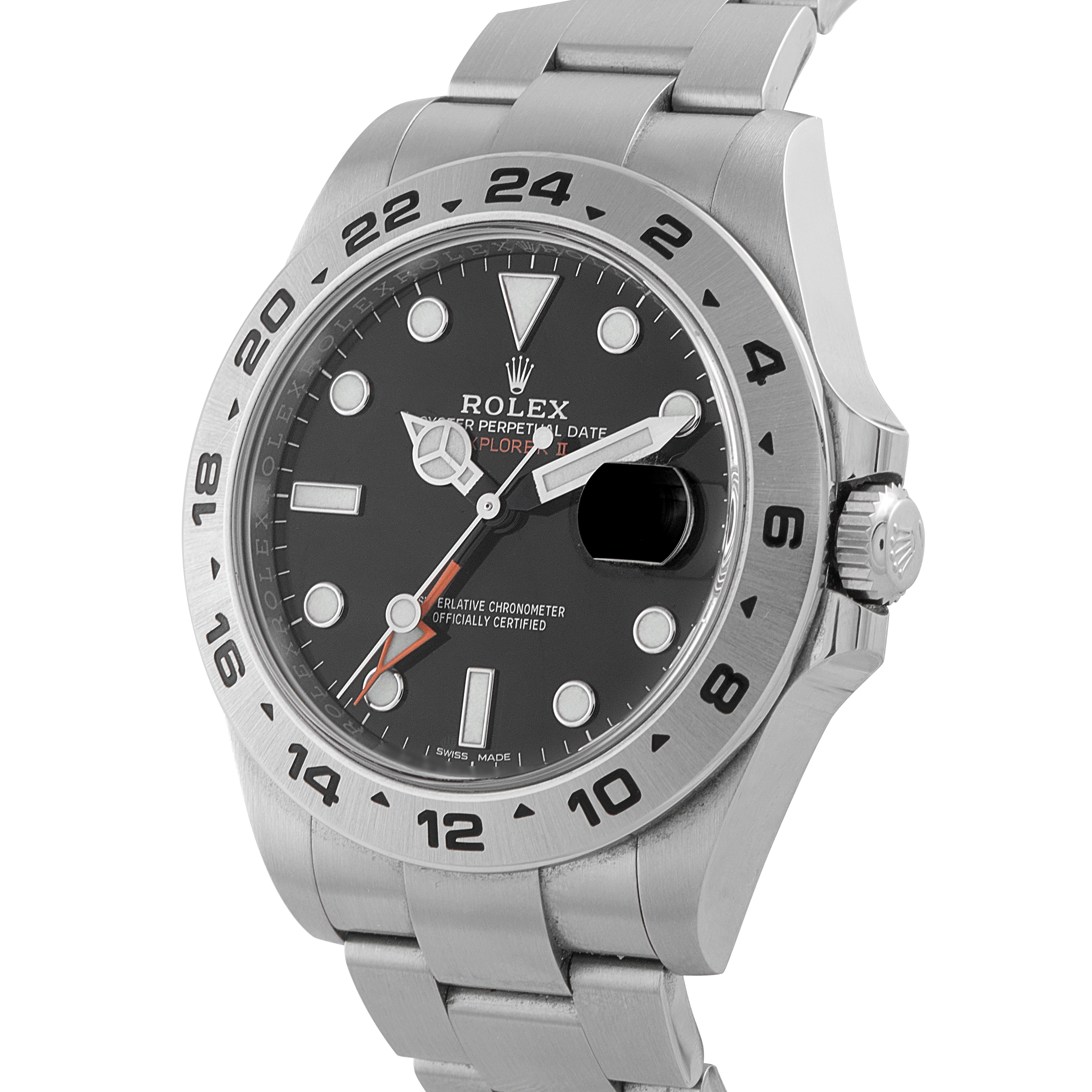 Papers and a gift box accompany this pre-owned Rolex Explorer II Black Dial Watch 216570.
