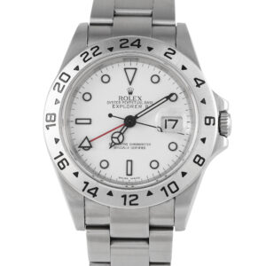 This pre-owned Rolex Explorer II Polar White Dial Steel Watch 16570 is accompanied by papers and the manufacturer’s box.