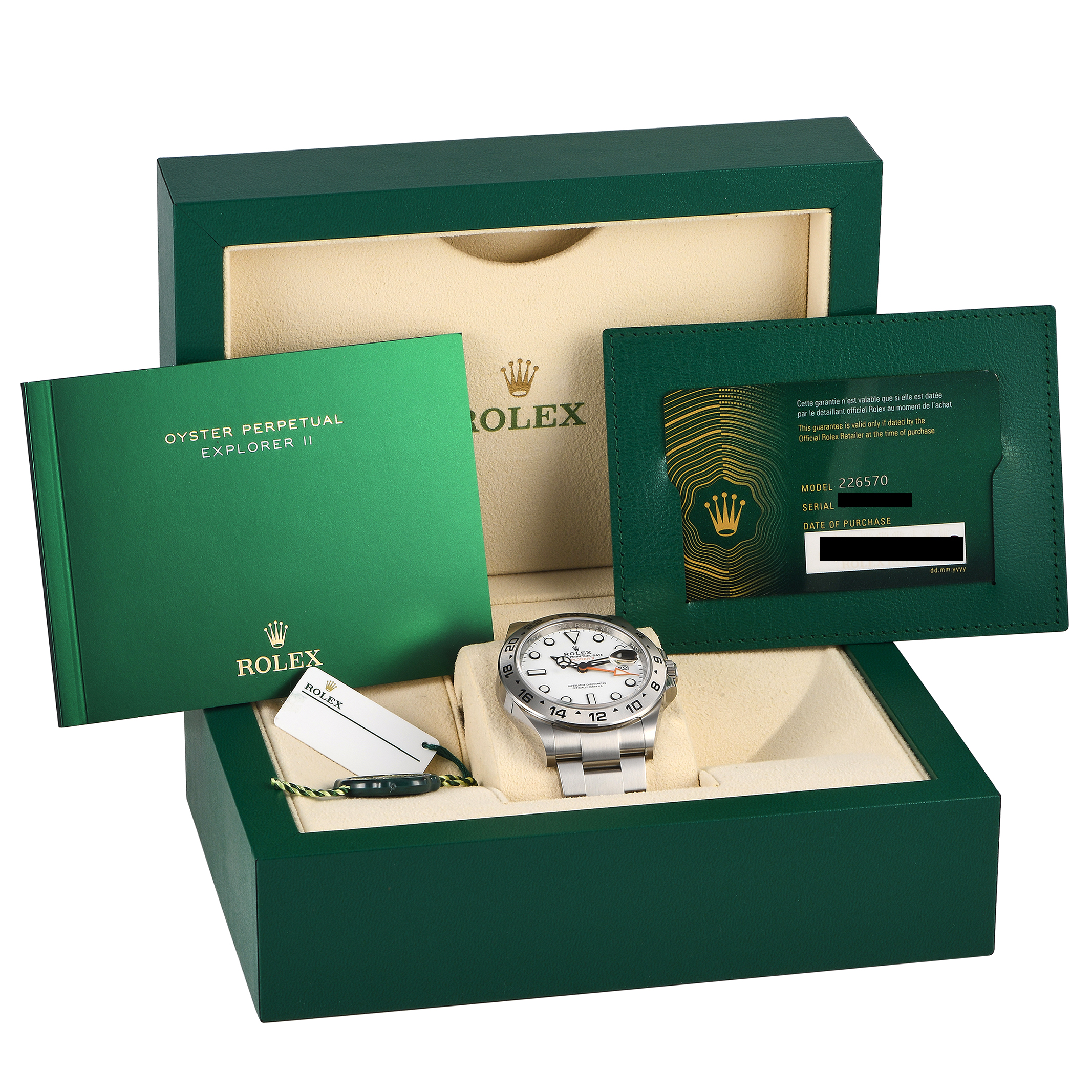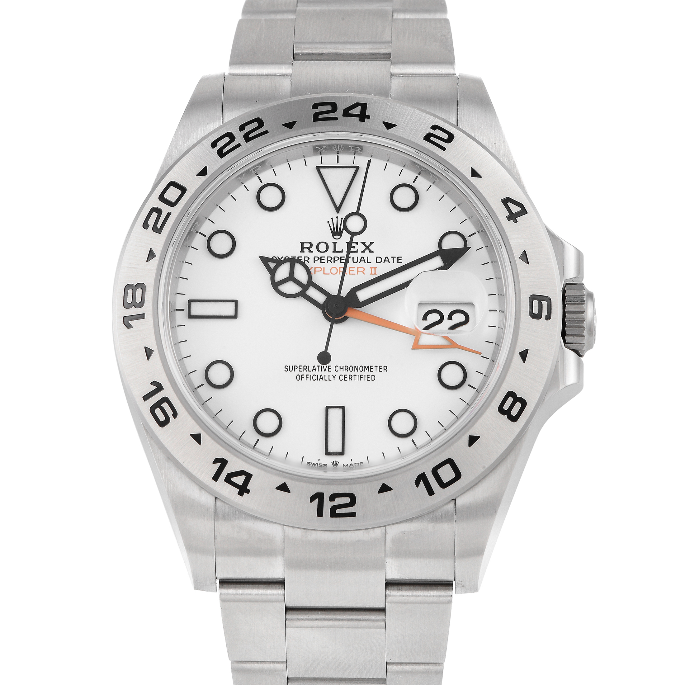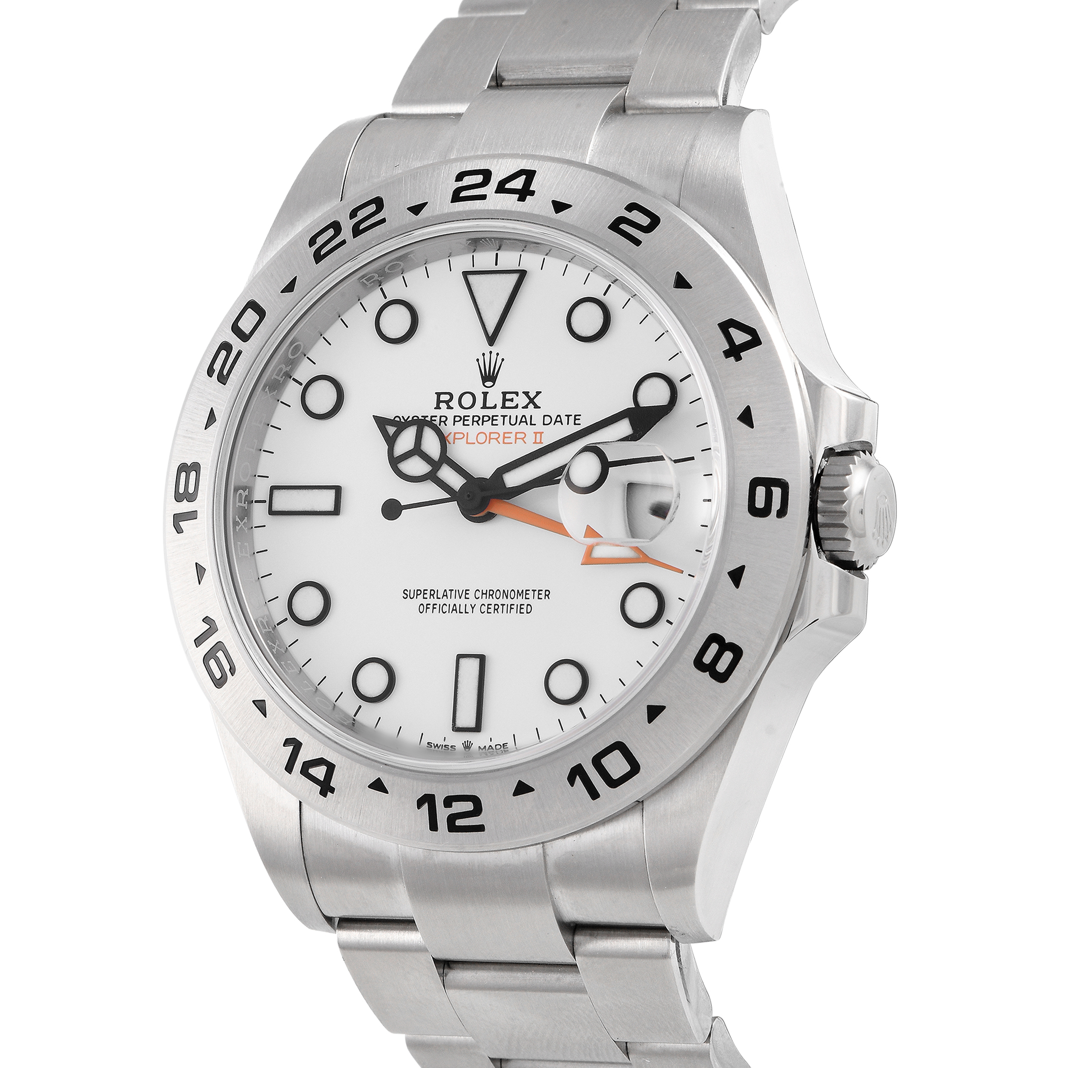 This pre-owned Rolex Explorer II White Dial Watch 226570 is accompanied by papers and the manufacturer’s box.