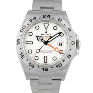 Offered pre-owned, this Rolex Explorer II White Polar Dial Steel Watch 226570 comes with papers and the manufacturer’s box.